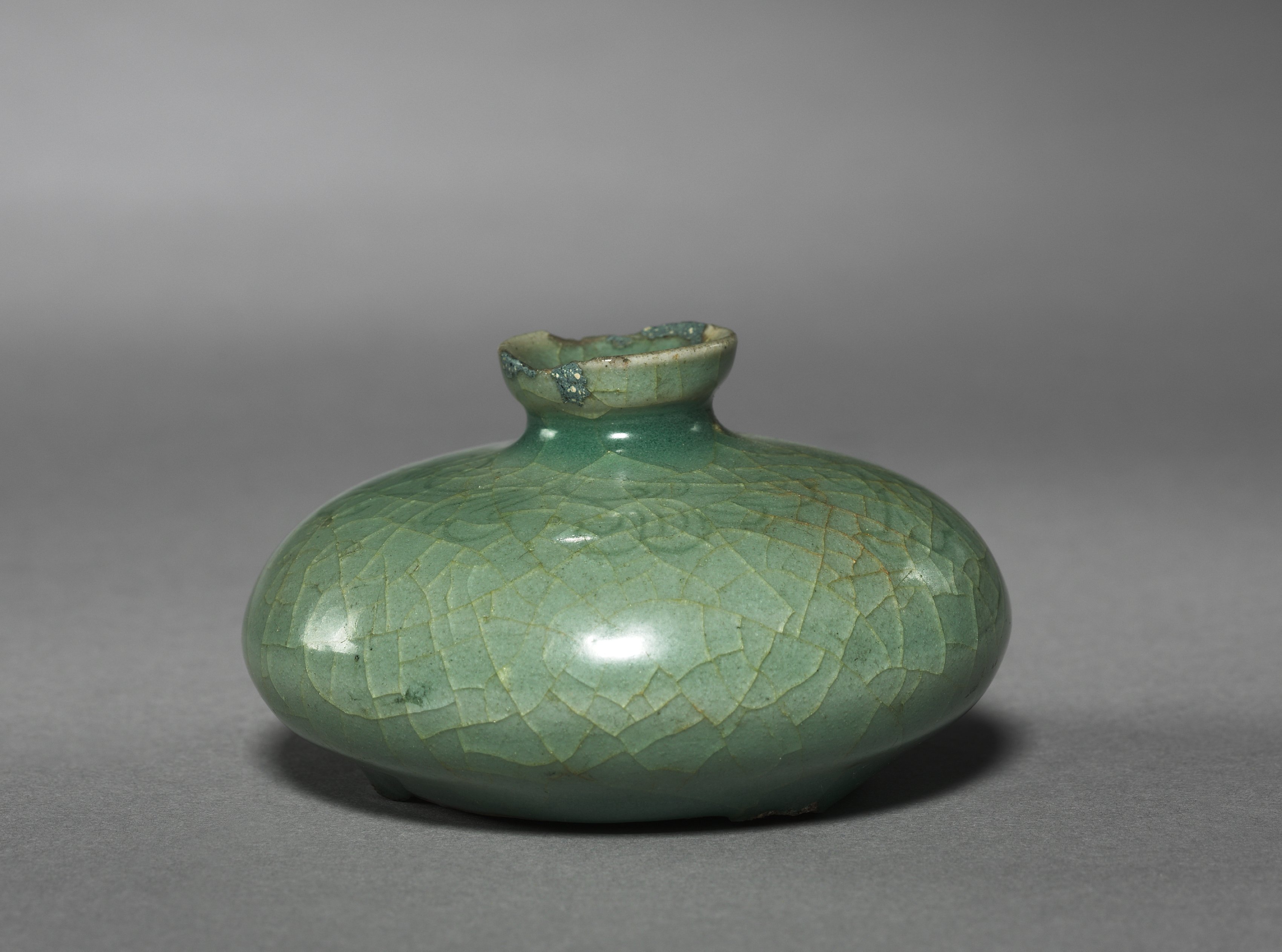 The image shows a green ceramic oil bottle with a scroll design. The bottle is bulbous with a short neck and small mouth. The body of the bottle is round and has a wide, curved shape. The glaze is green with a crackle pattern. The crackle pattern consists of small, irregular lines that resemble a network of fine cracks. The neck of the bottle is short and narrow, with a small mouth. The mouth has a small, rounded rim. The background of the image is gray, with a slight shadow cast by the bottle. The overall appearance of the bottle suggests that it is an antique or vintage item, possibly from China. The scroll design mentioned in the title is not visible.