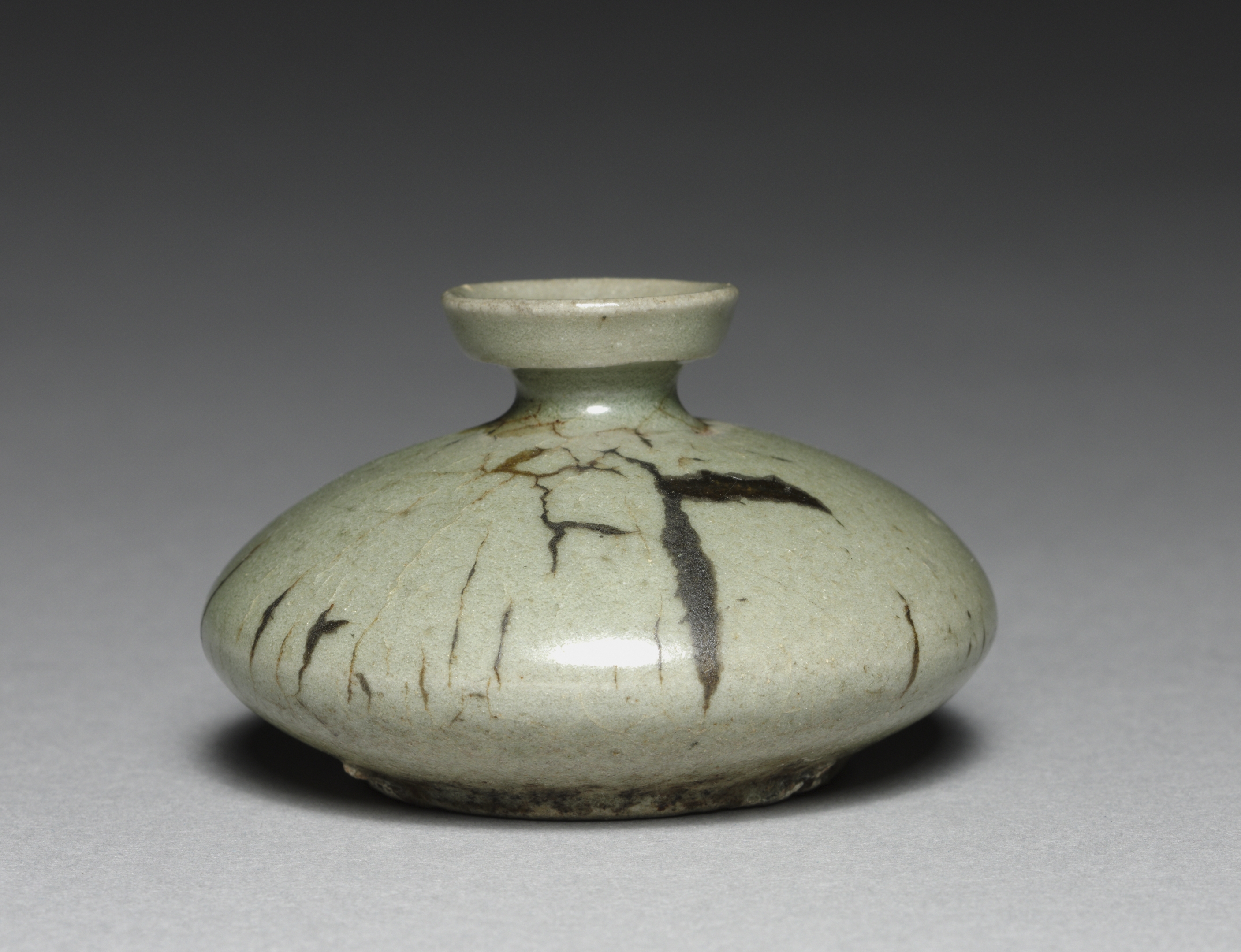 The image depicts an "Oil Bottle" by an unknown artist. The object is a small, ceramic vase. The vase has a bulbous body and a narrow neck. The vase is primarily light green with darker green and black streaks. The base of the vase appears to be unglazed and dark in color. The background is gray and darkens toward the top. The object casts a shadow on the surface below it.