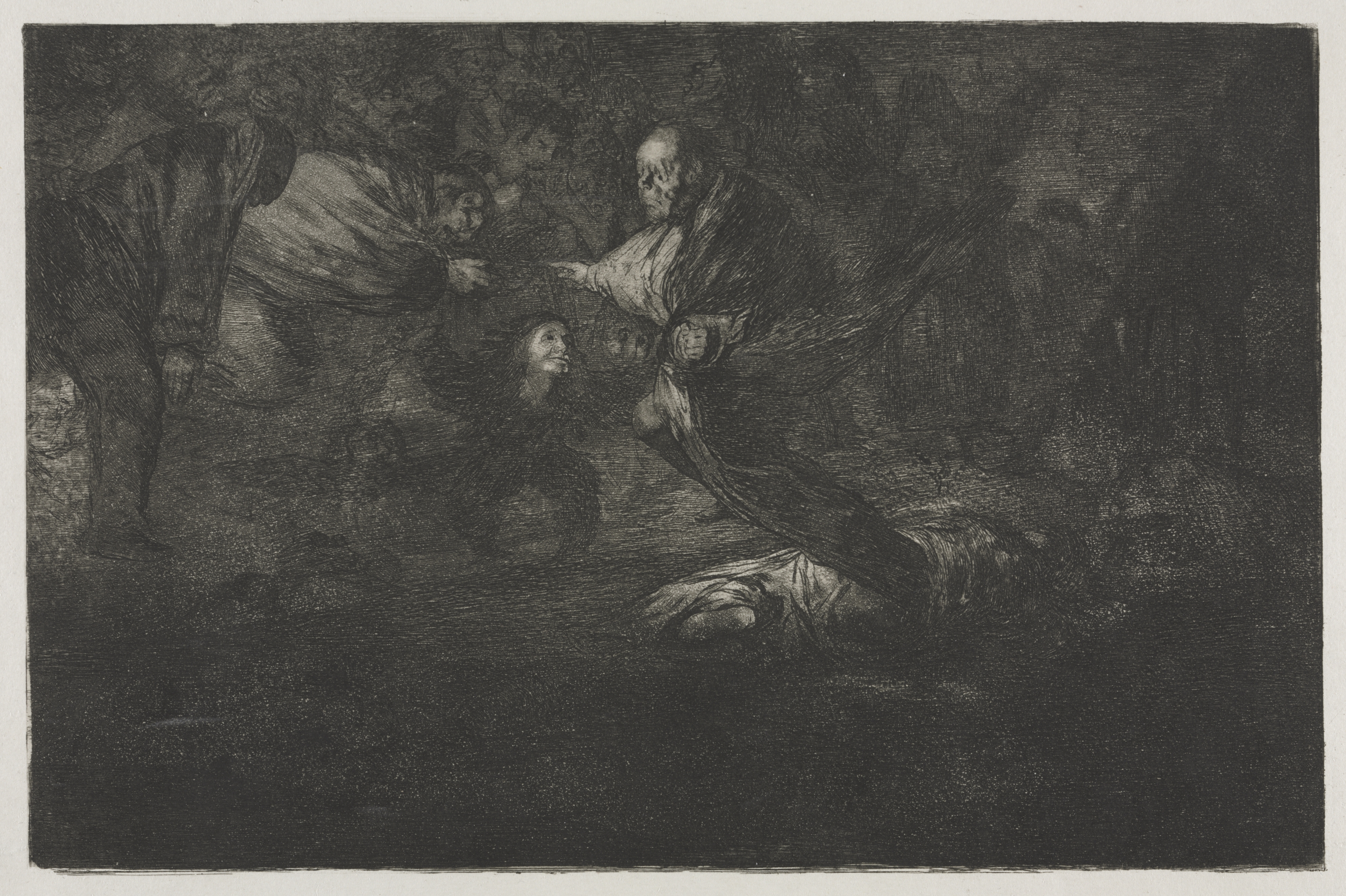 The Proverbs: God Creates Them and They Join Up Together by Francisco de Goya. A dark monochromatic artwork depicting a scene with several figures. A man points to the right with his right arm extended, standing over a woman lying on the ground. Two other figures are to his left, one behind the other. The standing man and the two figures to his left appear to be dressed in dark, flowing clothing. The background is dark and shadowy with some lighter areas suggesting foliage or other details. The overall mood of the image appears somber and intense. The artwork appears to be a print or engraving with visible texture and cross-hatching.