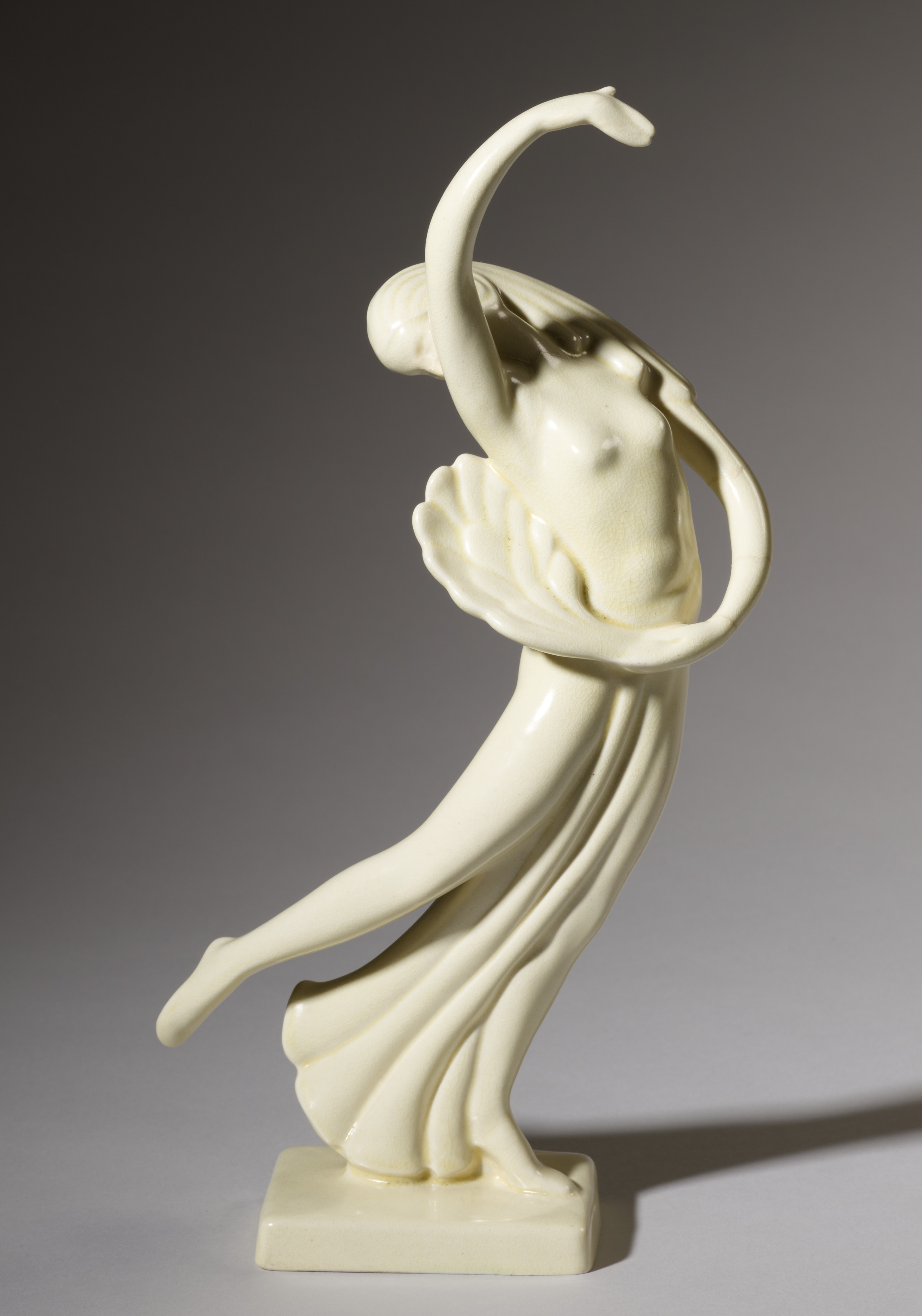 White sculpture of a female figure, titled "Fan Dancer" by Waylande Gregory. The figure is depicted with her body facing right. The woman's facial features are not detailed. She wears a long, flowing dress that appears to be made of a lightweight material, with folds and creases suggesting movement. The dress flows behind her and around her body. Her right arm is raised above her head, curved and holding a fan. Her left arm is bent at the elbow, with her hand on her hip. The sculpture stands on a square base. The background is gray.