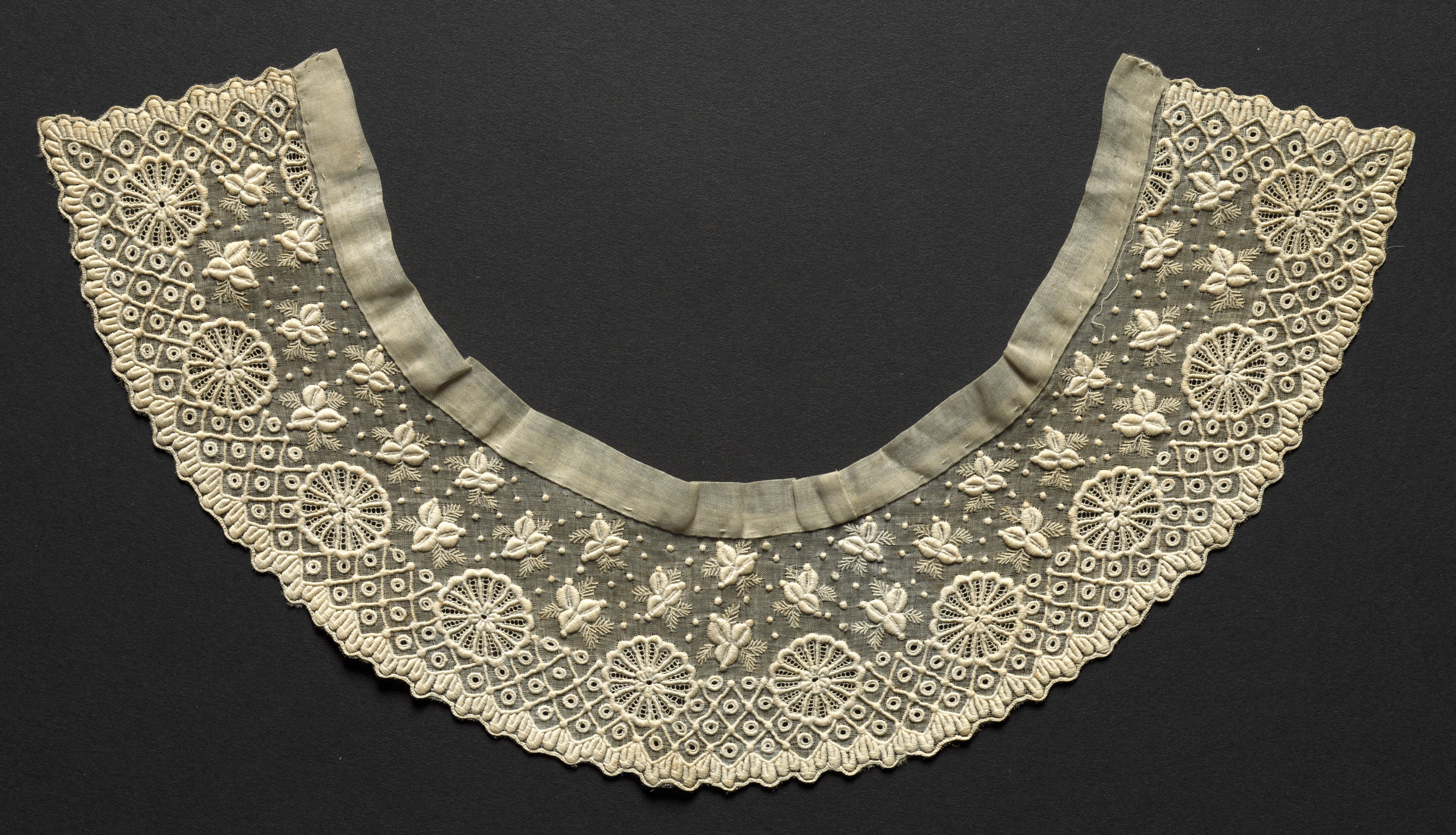 Beige embroidered collar, "Embroidered Collar" by unknown artist. The collar is semi-circular and made of beige lace with floral patterns and geometric designs. It features a satin ribbon trim along the top edge. The lace is intricately designed with flowers, leaves, and circular motifs. The background of the image is black.