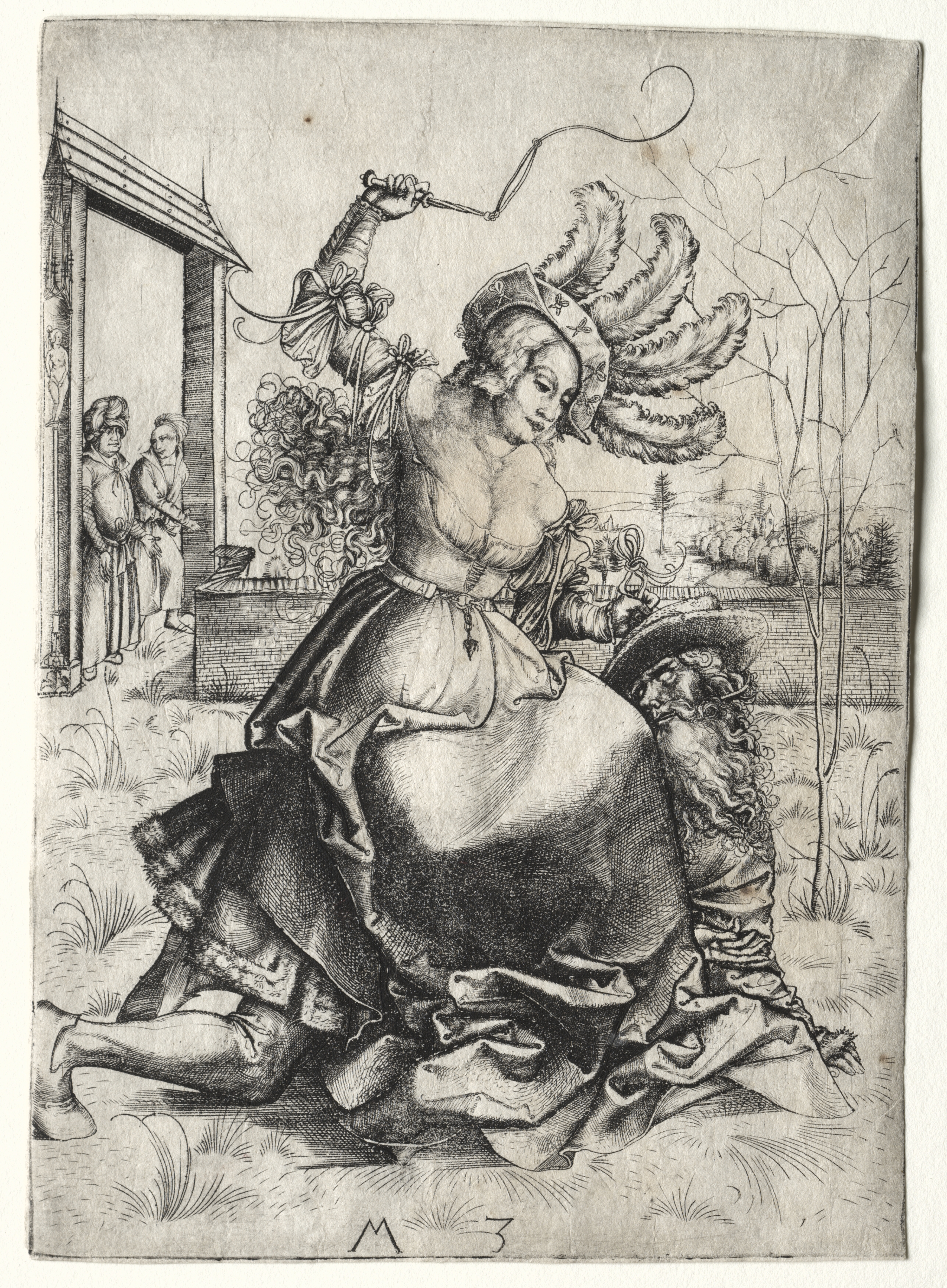 The engraving depicts a scene with a woman wearing a large hat with feathers and a ruffled dress. She is holding a sword in her right hand, raised above her head. The woman appears to be standing over a man who is on the ground, wearing a hat and looking up at her. In the background, there are two people standing in an open doorway to the left, and a low brick wall with trees and a town in the distance to the right. A building with a sloping roof is on the left. The scene appears to be set outdoors with some grass and bare trees visible. The title is "Aristotle and Philis" and the artist is Master MZ.