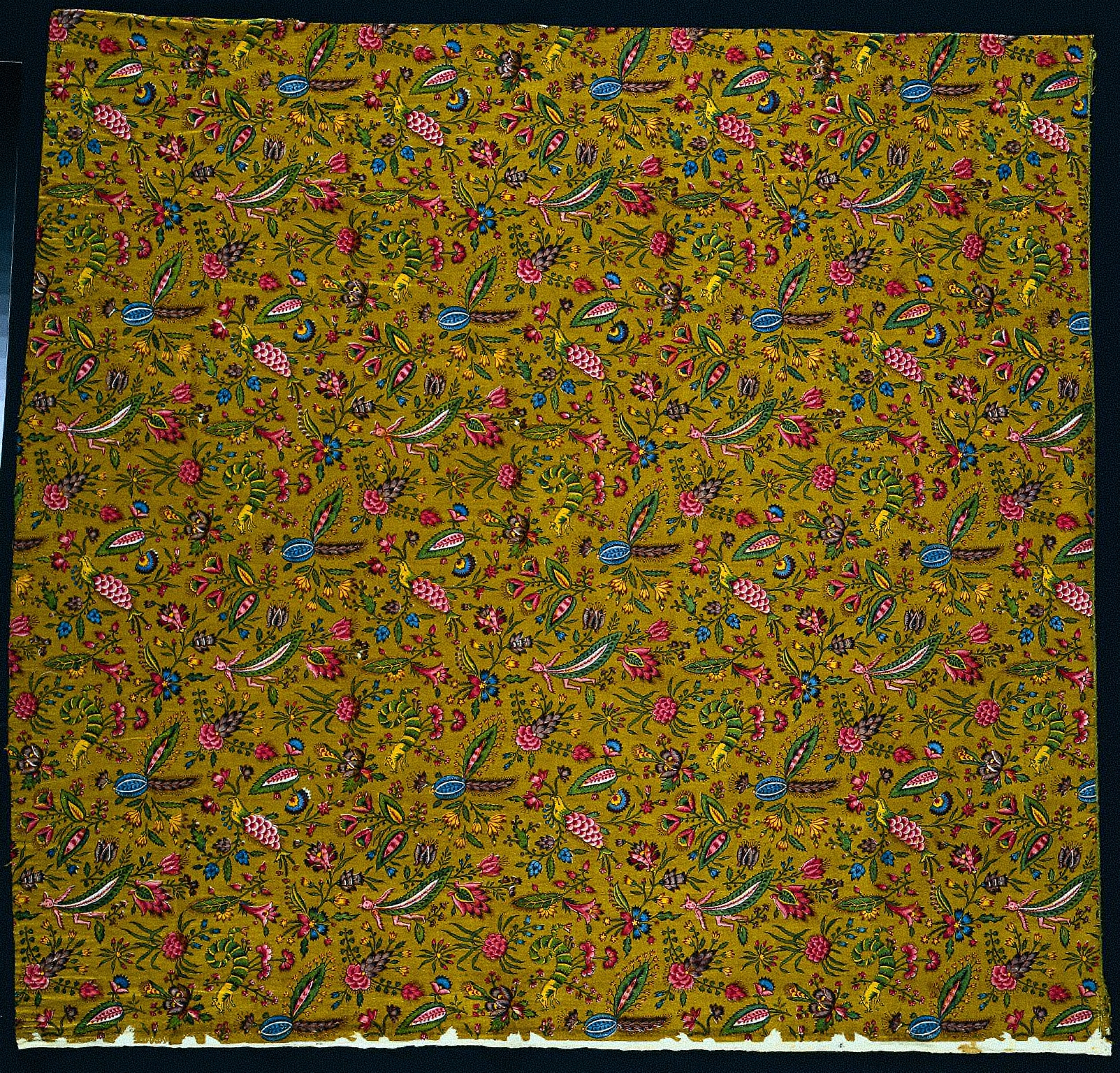 Yellow fabric with a dense repeating pattern of multicolored flowers, leaves and birds. The fabric is square and the pattern is printed in a woodblock style. The background of the fabric is a solid yellow color. The flowers are pink, blue, and red. The leaves are green and blue. The birds are white, blue, and pink. The fabric has a rough edge around the perimeter.