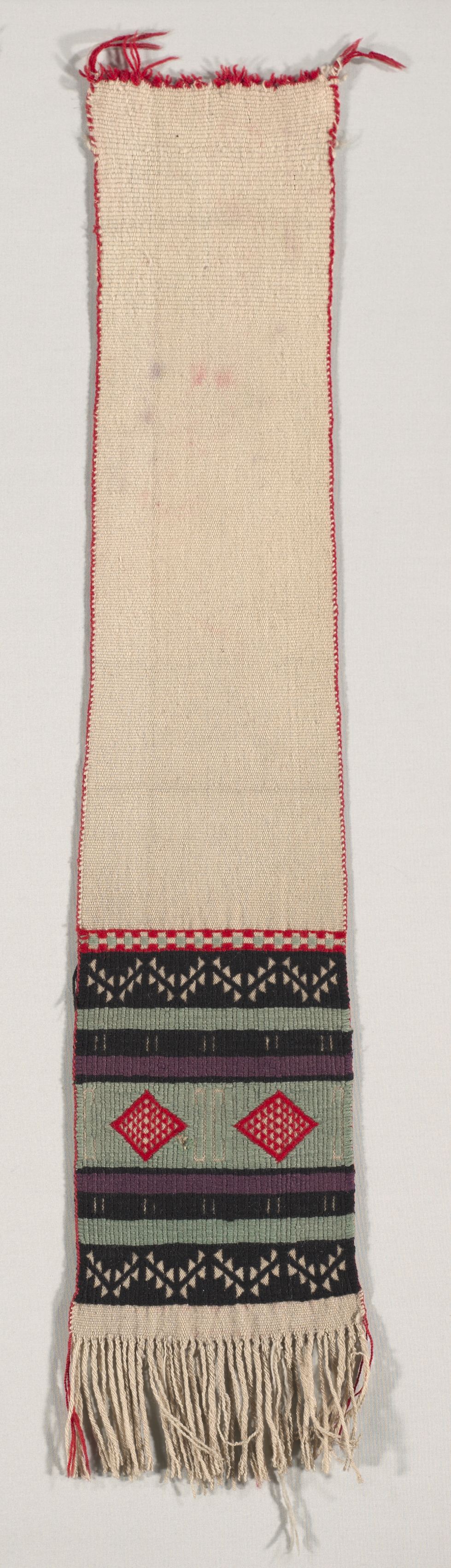 Long, narrow, tan-colored textile with frayed edges and fringe at the bottom. The top section is tan with red stitching around the edges. The bottom section features a patterned band with horizontal stripes in black, purple, green, and tan. The band includes two red diamonds with white centers, and other tan and white geometric patterns. The fringe at the bottom is tan with some red threads. The title of the textile is "Hopi Brocade" and the style is a dance sash.