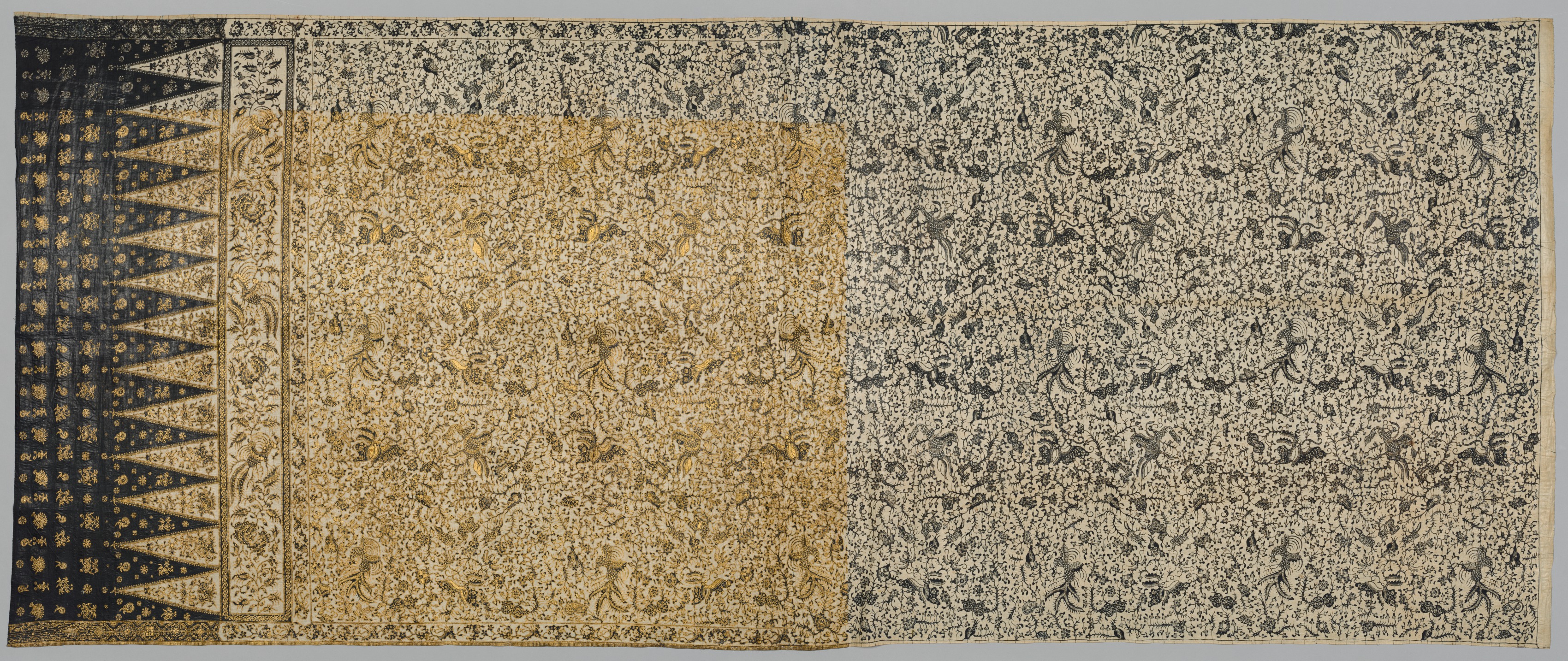 The image depicts a textile with the title "Sarong". The textile has a black border on the left side with a gold pattern. The black border contains small gold circles. On the left edge, there are triangular gold shapes pointing towards the center. The main body of the textile is divided into two sections. The left section is gold with a dense floral pattern. The right section is beige with a dense dark pattern. The textile appears to be rectangular in shape. The background behind the textile is gray.