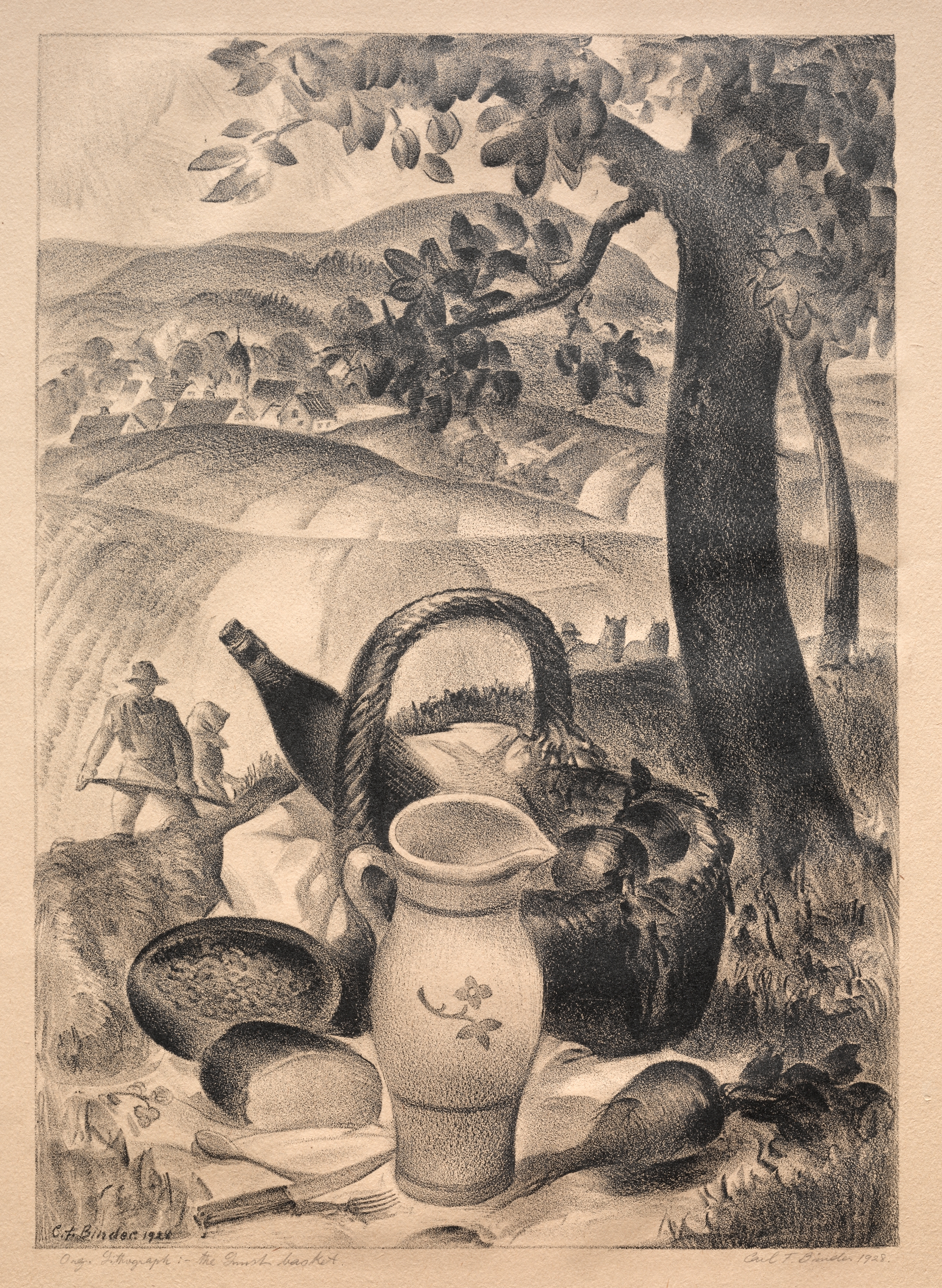 The image depicts a landscape with rolling hills and trees. A large tree trunk is on the right. In the background, two people are sitting on a hillside. In the foreground, a picnic scene is set up. A large jug with a floral design is in center. To the left of the jug is a bowl of food and a plate with bread. A basket with a handle is behind the jug, containing more food items and a bottle. A fork and another object are on the ground to the right of the plate. The entire image is in shades of gray. The title is "The Lunch Basket" and the artist is Carl F. Binder.