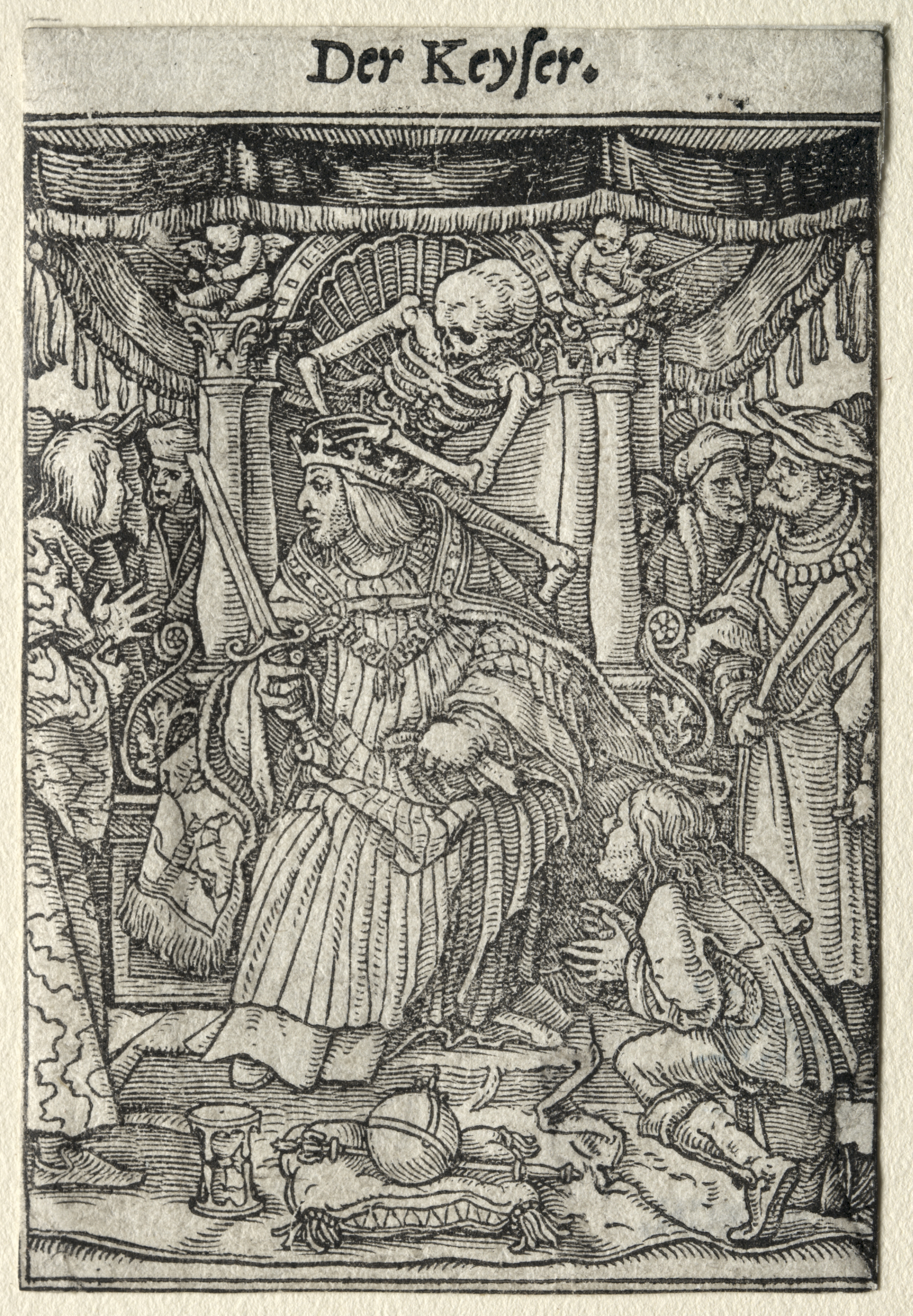 Black and white woodcut image of the Dance of Death: The Emperor. The central figure is a man with long hair sitting on a large ornate throne; he wears a long robe, and a hat. A man kneels before him to his right. The emperor's left arm rests on the arm of the throne and his right arm seems to gesture. Behind the emperor on his right are two men wearing hats and ornate necklaces; both carry staffs. To his left, on his far side, a third man with an ornate staff faces the emperor and a fourth individual faces away. Above, a skeleton sits on the backrest of the throne, playing a fiddle. The background features fabric draped over what appears to be pillars; there are cherubs sitting on the drapery above the pillars. In the foreground are objects on a floor including an hourglass, globe, and crown. The top of the image contains a text box with stylized text reading "Der Keyser".