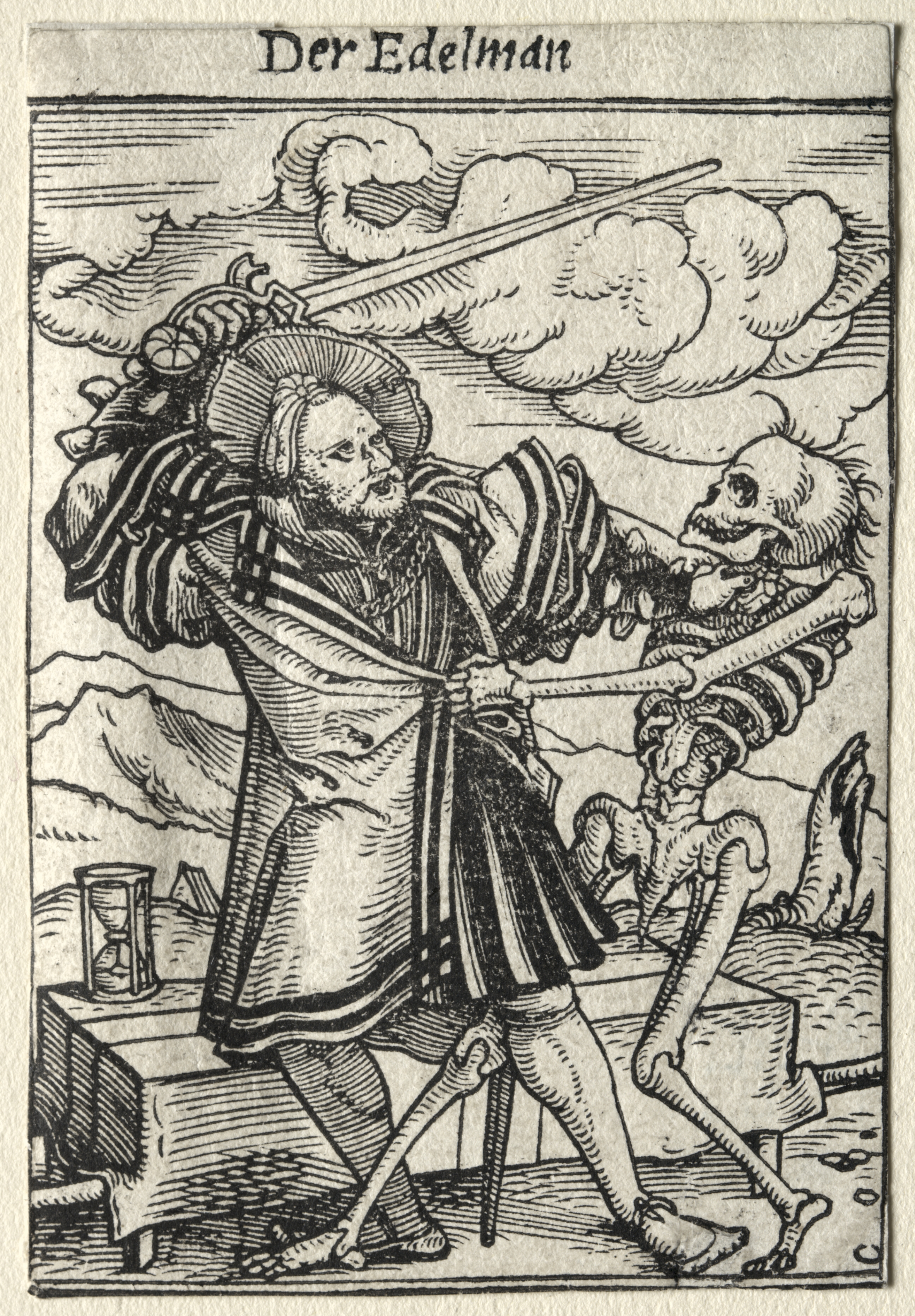 Black and white drawing of a man in 16th-century clothing holding a sword and struggling with a skeleton. The man wears a large hat, a puffy-sleeved jacket, a short skirt, and tights. The skeleton wears a hat. The man and skeleton grasp each other's right wrists. The man holds a sword in his left hand. An hourglass and book sit on a table to the left. The background shows clouds, mountains and a landscape. The image has a border around it. The text at the top of the image reads "Der Edelmann".