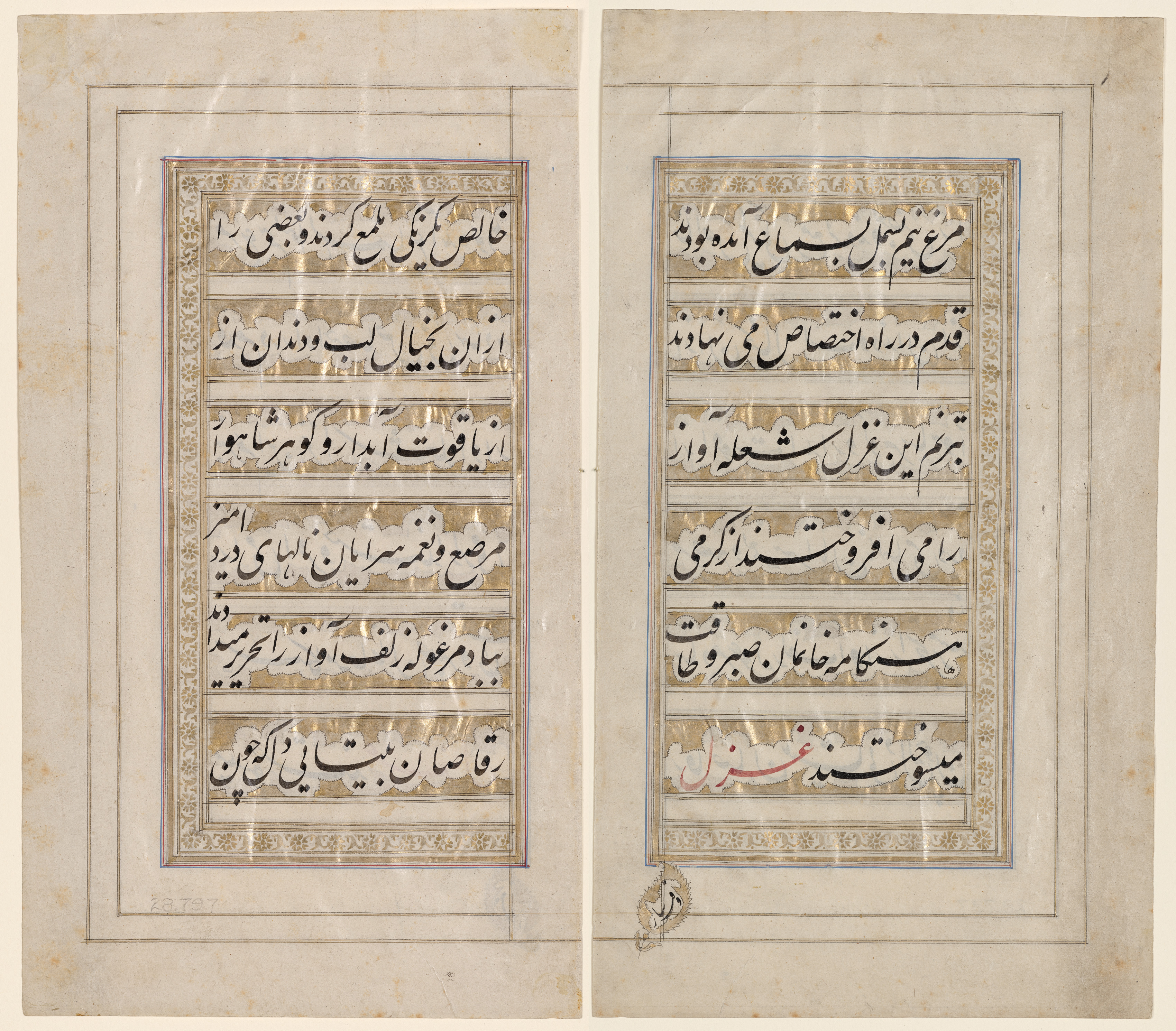Two pages of an aged book with Arabic script. The pages are yellowed with age and have a darker perimeter and lighter center. Each page has a border around the writing. The borders have a thin blue line on the inside, then a thicker gold rectangle with a patterned design on the perimeter. The text on both pages is written in black ink. There are red accents on one line on the right. The pages on the bottom have a darker stain and some white reflectivity. The pages are side by side with a white background.