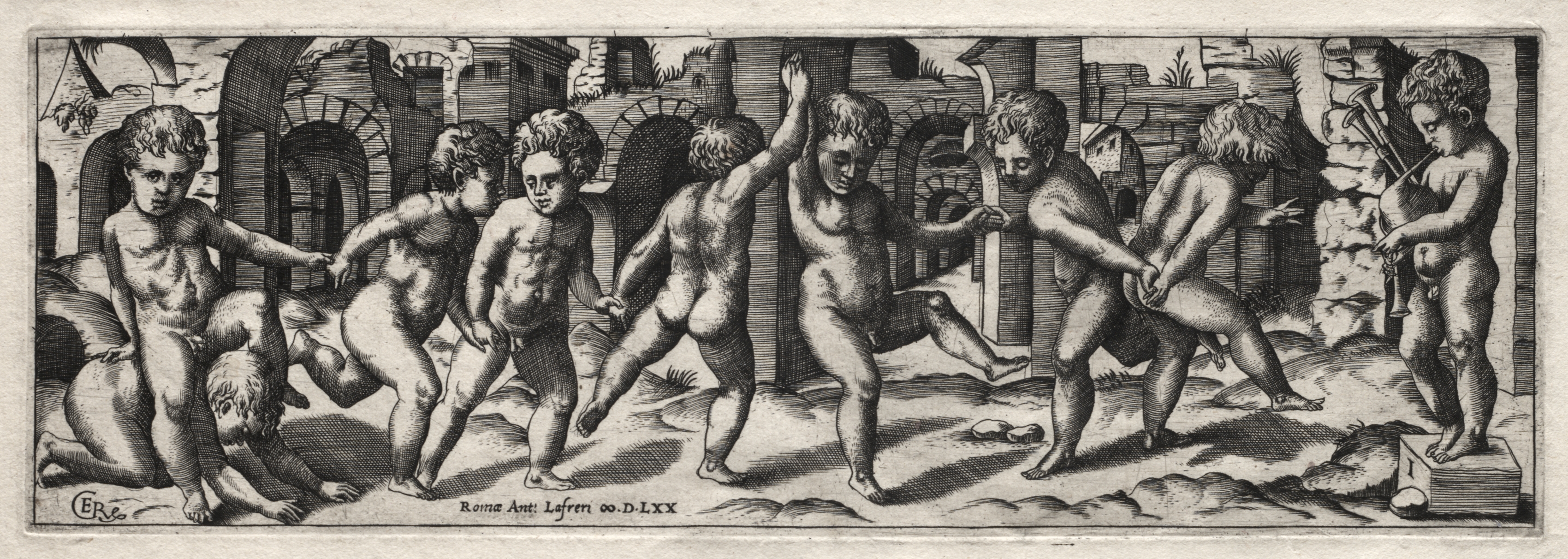 Black and white image of a line of naked children dancing. The children are all in different poses, most with one leg raised. Seven children are shown in total. The child on the far right is playing a bagpipe. The children are standing on ground with visible rocks. The background shows a stone wall with multiple archways. The wall in the background has crumbling features. The image is rectangular in shape. The image is an engraving. The artist's monogram is in the bottom-left corner. Text is written at the bottom centre.