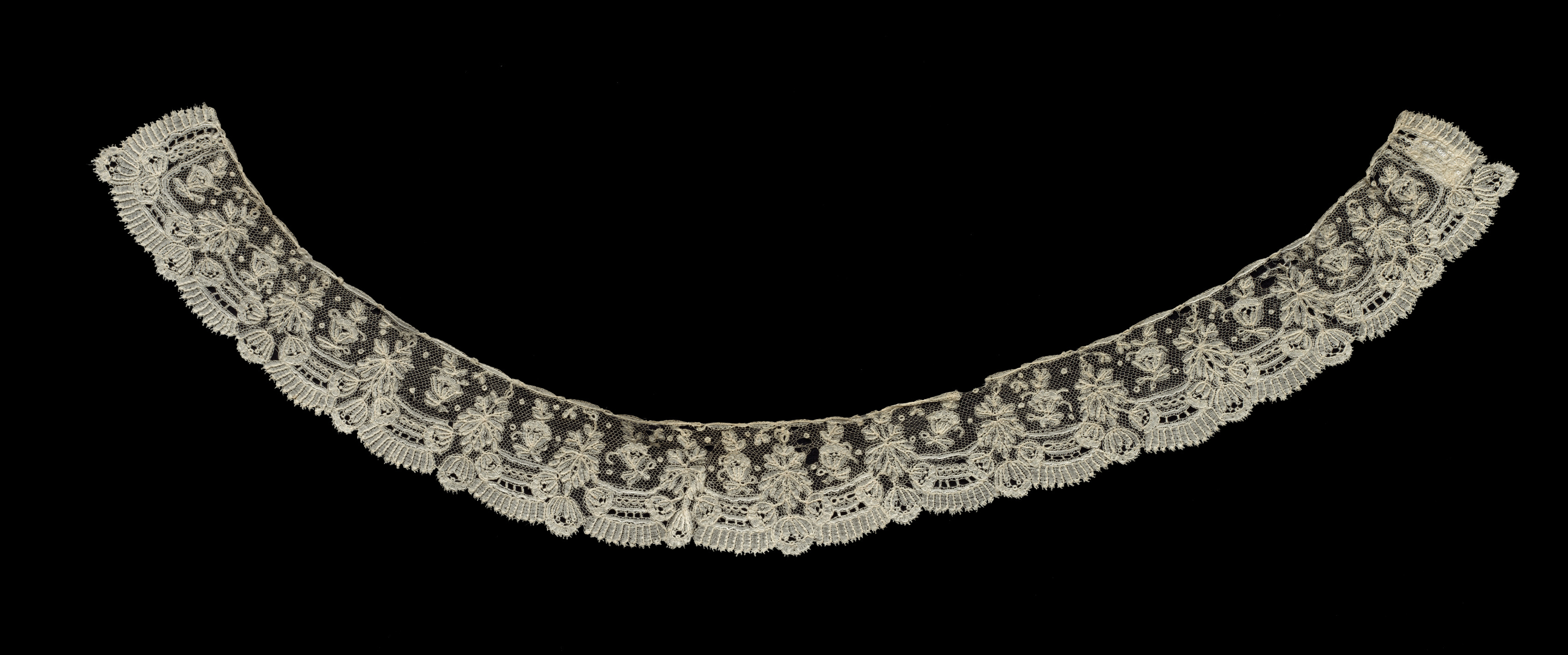 The "Bobbin Lace Collar" by an unknown artist is an off-white, intricately designed lace piece. The collar is curved, resembling the shape of a half-circle or a crescent, and features a dense floral pattern throughout. The lace has a scalloped edge with a fringe-like trim along the bottom. The background of the image is solid black. The lace appears to be made of a delicate, possibly linen or cotton, thread. The intricate design includes repeating floral motifs and leaf-like shapes. The overall appearance of the lace suggests it is a traditional or antique piece. The collar does not have any visible fastenings or attachments. The image presents the lace against a plain, dark background to highlight its details. The lace's color is off-white or cream, with no other colors visible. The design is symmetrical, with the same pattern repeating on either side of the center. The lace's texture appears to be delicate and possibly fragile. The scalloped edge is uniform along the bottom of the collar.