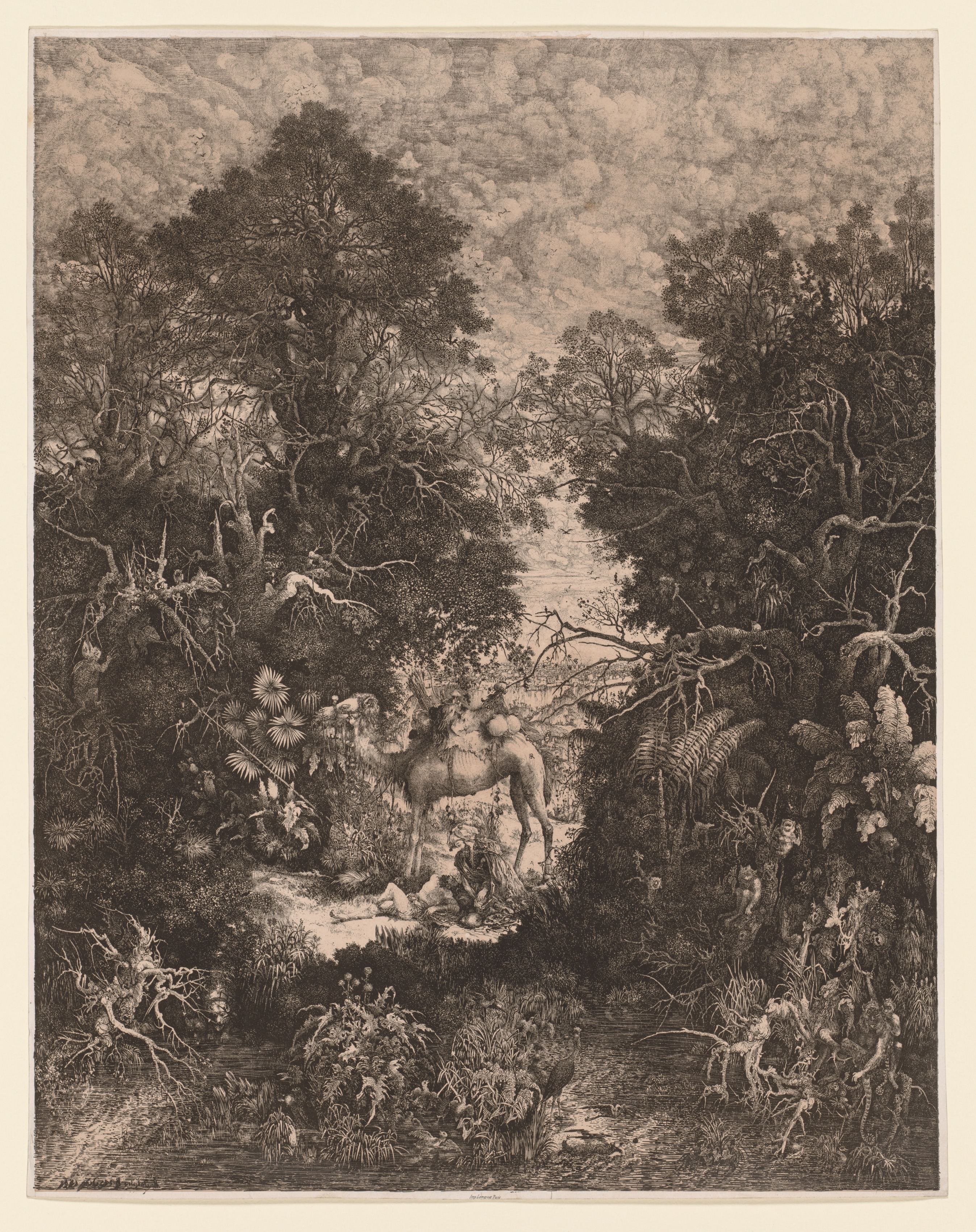 The Good Samaritan by Rodolphe Bresdin: A black and white drawing of a man and a camel in a forest. The man is standing next to the camel, and there appears to be a figure on the ground. The man is wearing a hat and has his body facing right, while his head and gaze are turned to the left. The camel faces the right. There are trees, bushes, and a stream in the foreground. The background contains more trees and possibly mountains or hills under a cloudy sky. The scene is densely detailed with a mix of dark and light shading. The image is rectangular.