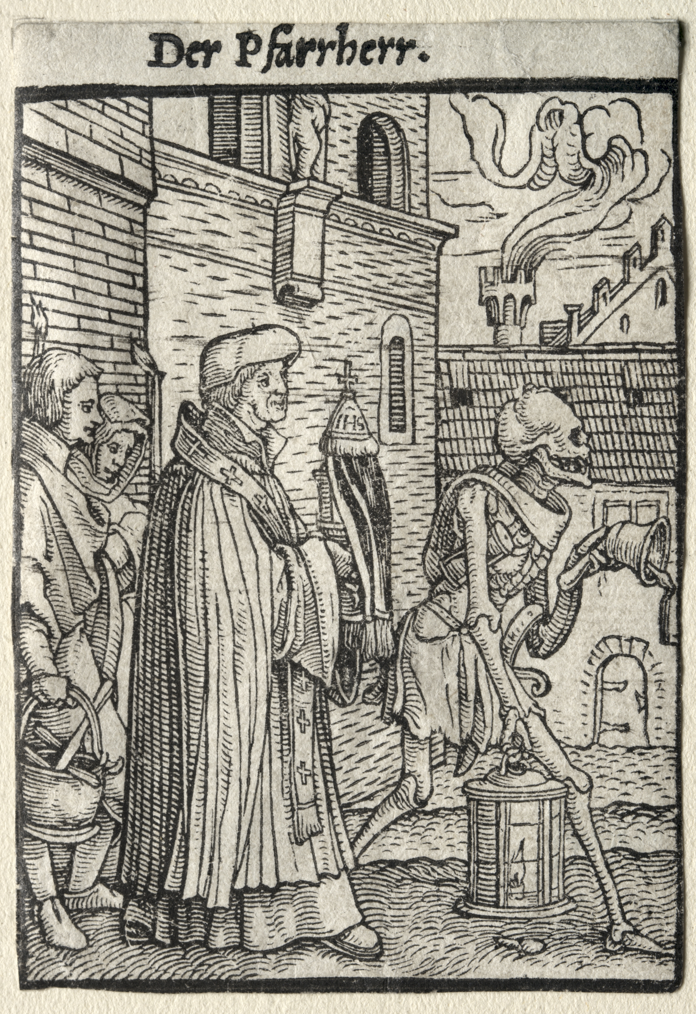 Black and white woodcut image of a man in clerical clothing talking to a skeleton. The man wears a long robe with a cross on the chest and a hat. He holds a covered container. The skeleton holds an hourglass. A man behind the cleric holds a pot. Buildings and a city skyline are in the background. The sky has clouds. German text is at the top.