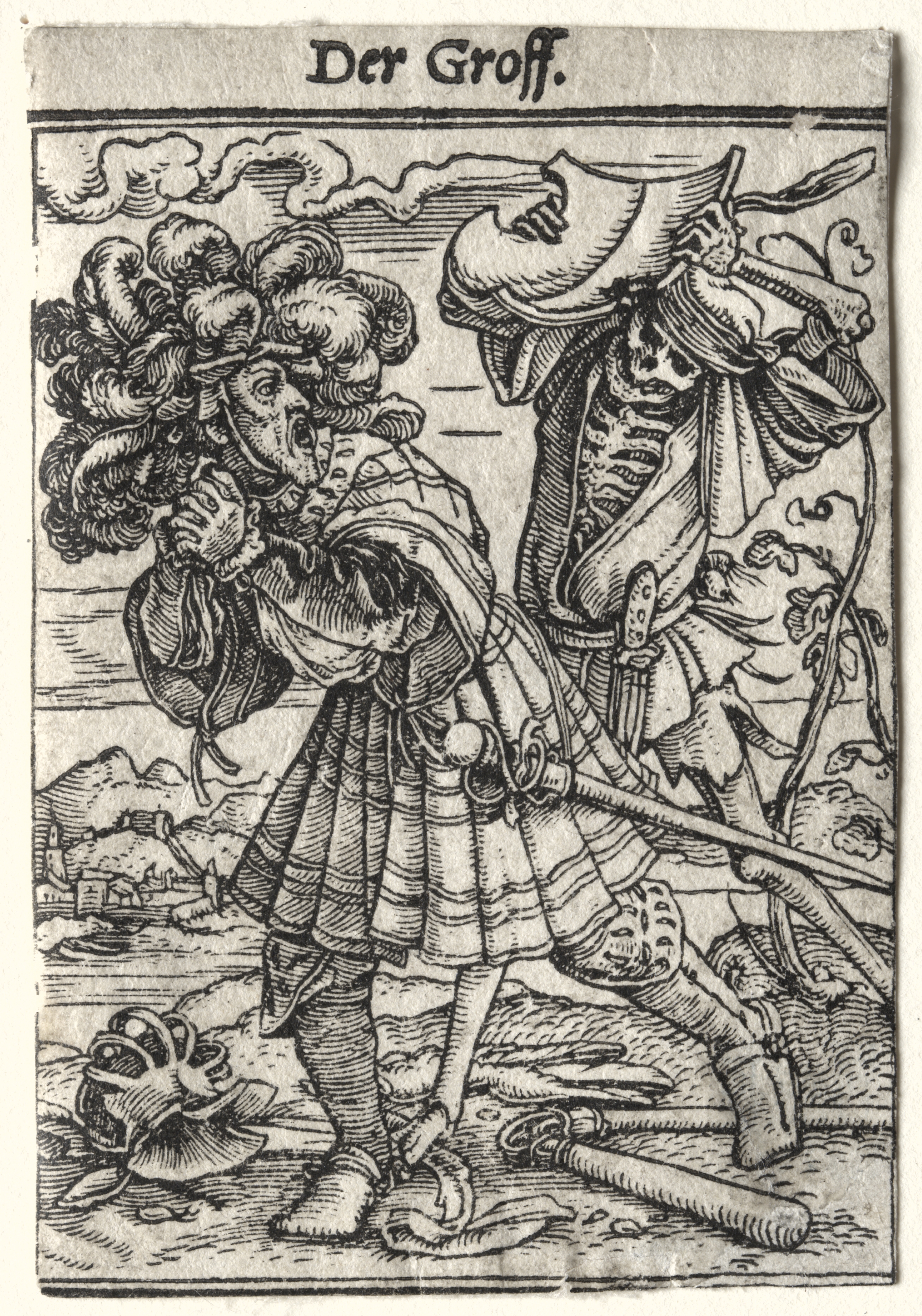 Black and white drawing of a man in ornate clothing holding his stomach and looking down. He has curly hair and a large hat on the ground next to him. A skeleton wearing a cloak and hat holds the man with a scythe. The background shows a landscape with hills and a building. The image has a caption at the top.