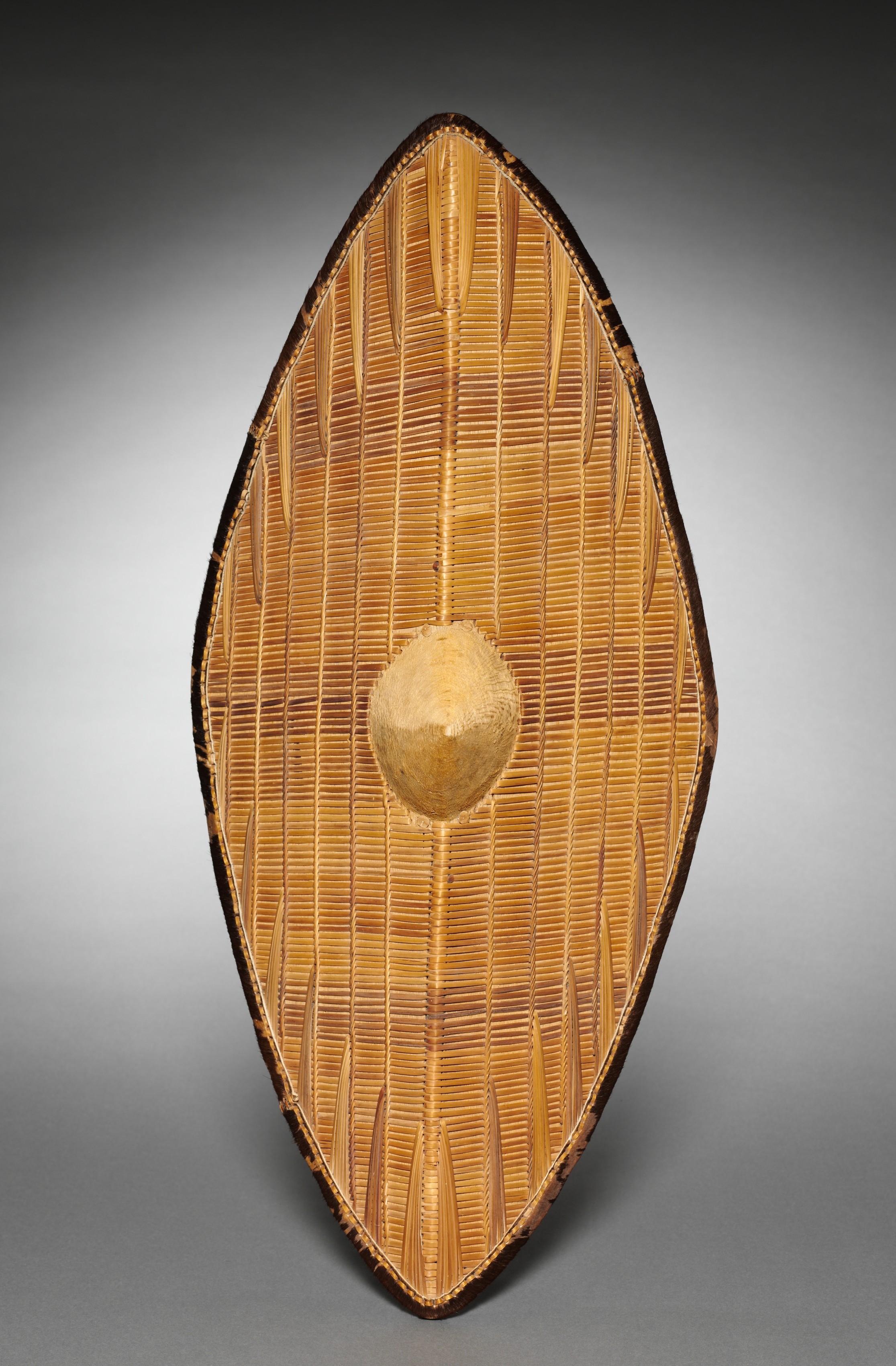 The image depicts a wooden shield titled "Shield" by an unknown artist. The shield is shield-shaped, wider at the top than the bottom, with a rounded point at the bottom. The shield has a raised circular section in the center. The shield is covered with thin strips of light-colored wood arranged in vertical lines. The shield has a dark-colored edge around the perimeter. The background is a gradient from white to dark gray.
