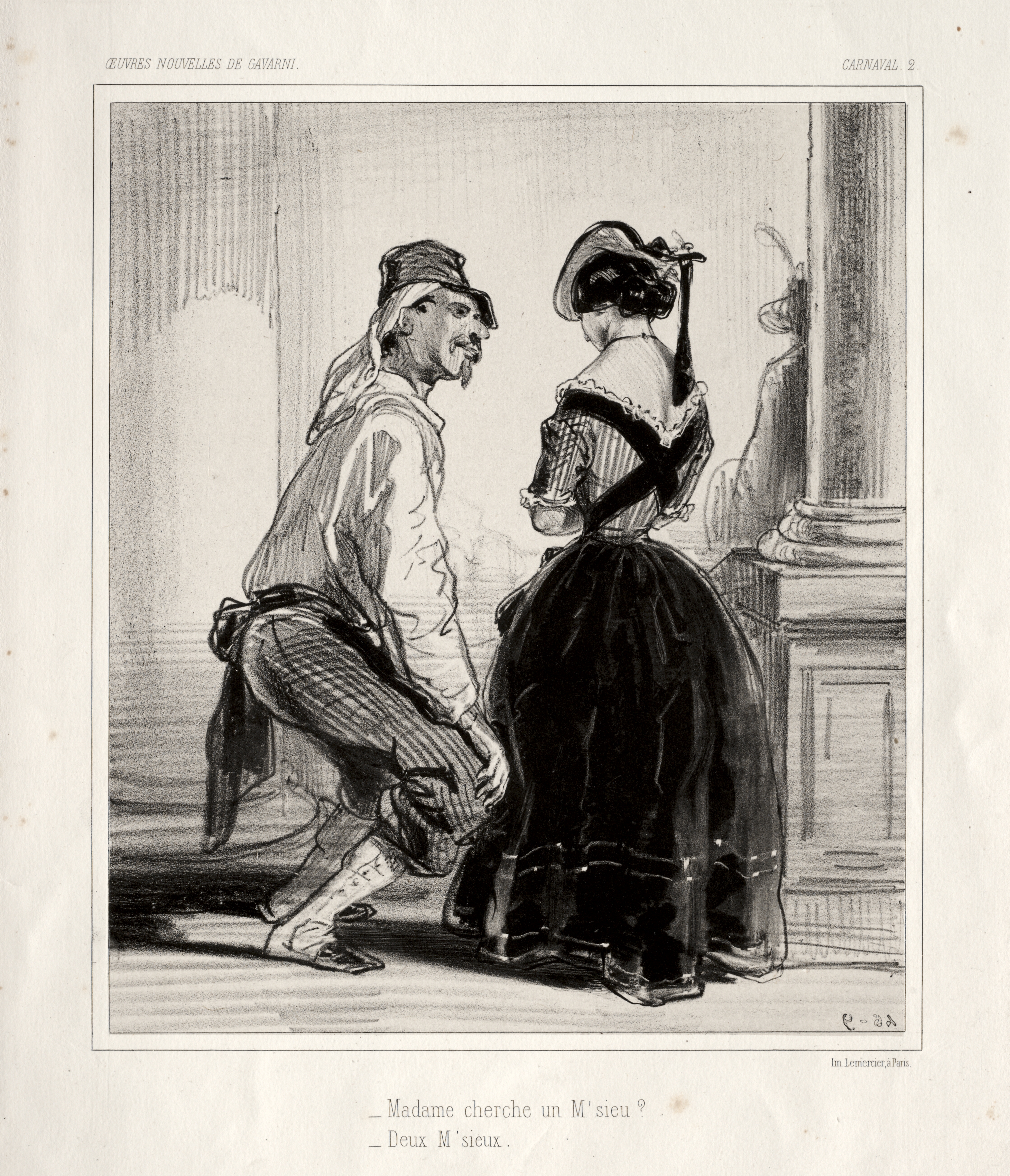 Black and white drawing of a man and a woman. The man is on the left; he wears a flat cap, a shirt with billowy sleeves, striped pants and a sash around his waist. He bends one knee and looks toward the woman on the right. The woman wears a dress with a full skirt, a low-backed bodice with a decorative collar, and a hat with a narrow brim; her dark hair is pulled into a low bun. She faces to the left. They appear to be indoors. The title "Carnaval" and artist "Paul Gavarni" are associated with the image.
