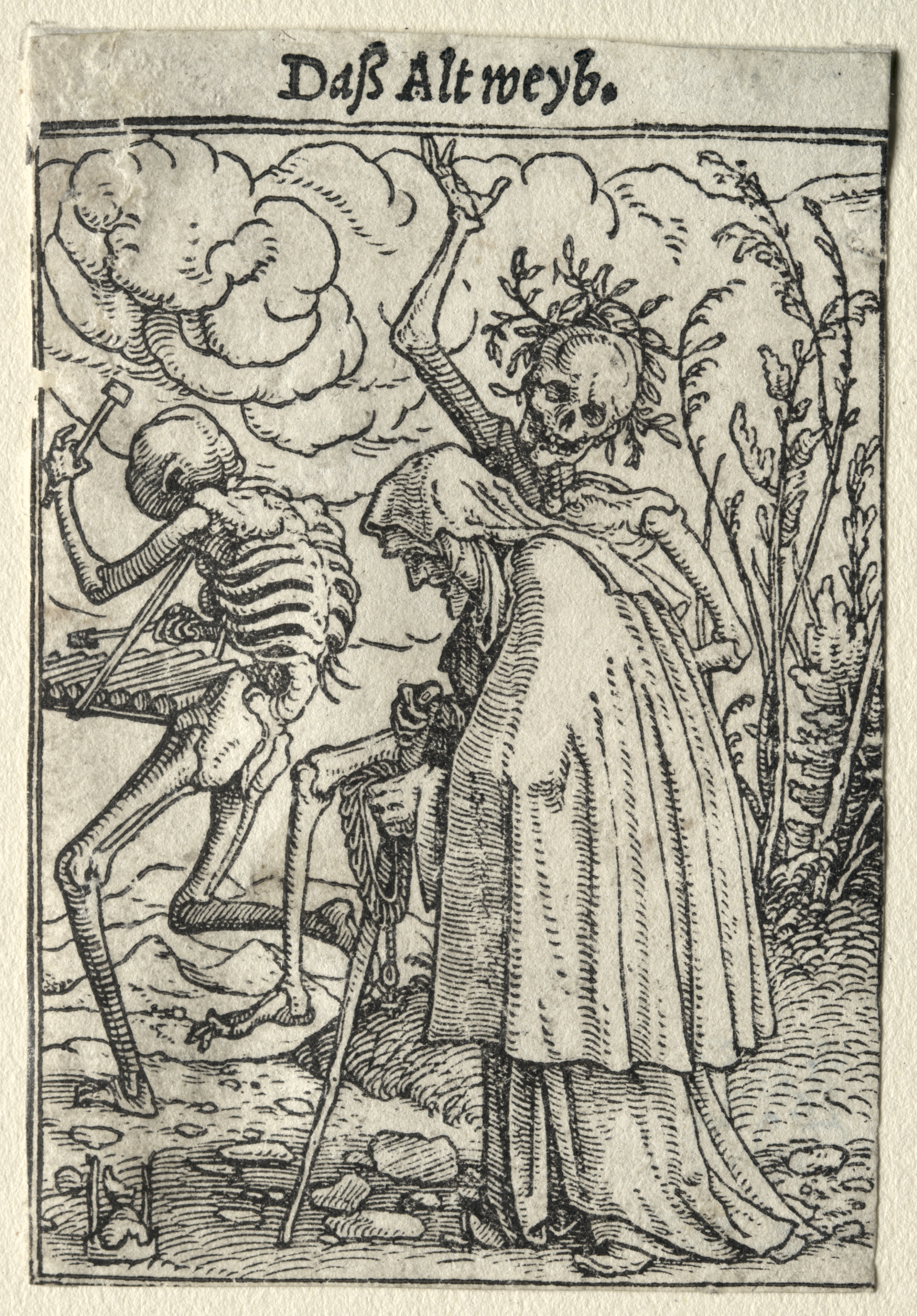 Black and white woodcut image of a dancing skeleton wearing a wreath and holding a pitchfork in one hand and a shovel or spade in the other. The skeleton appears to be dancing on a dirt path with its right leg lifted. Facing the skeleton is an old woman. She has her head bowed and her back slightly arched. She supports herself with a walking stick held tightly in her right hand. She wears a long dress and a head covering. A line of trees appears on the right side of the image. The background includes a cloudy sky. The image is bordered with a simple line and includes German text at the top.