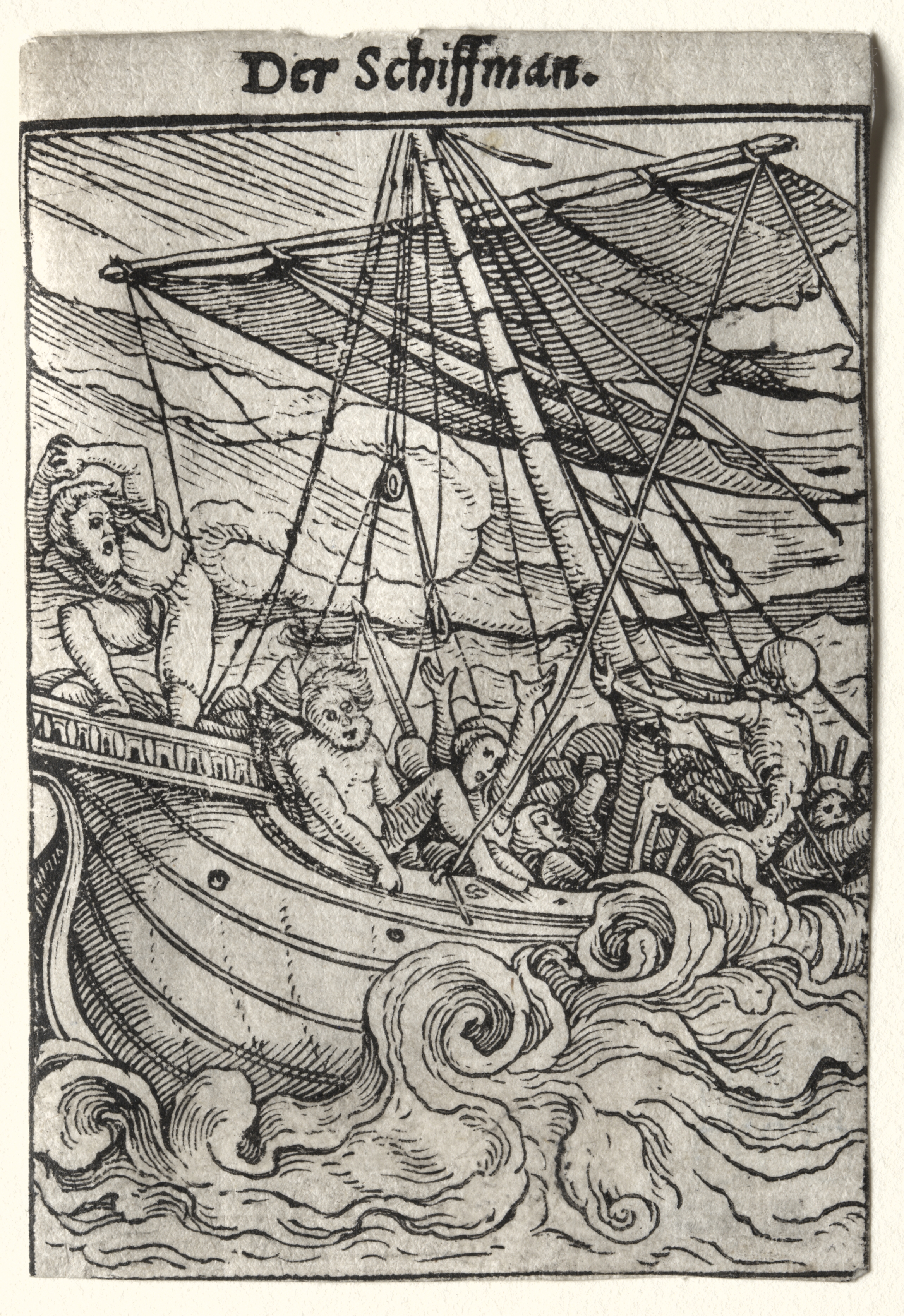 Black and white woodcut image of a boat on a choppy sea. The boat has a single mast with a square sail and several ropes. The boat has a curved bow and a flat stern. There are four men in the boat. A man on the left points toward the sky. A man at the bow holds a long pole. A skeletal figure wearing a hat steers the boat. A man on the right falls into the water. The water around the boat is choppy with several waves. The sky has several clouds. The text at the top of the image reads "Der Schiffman".
