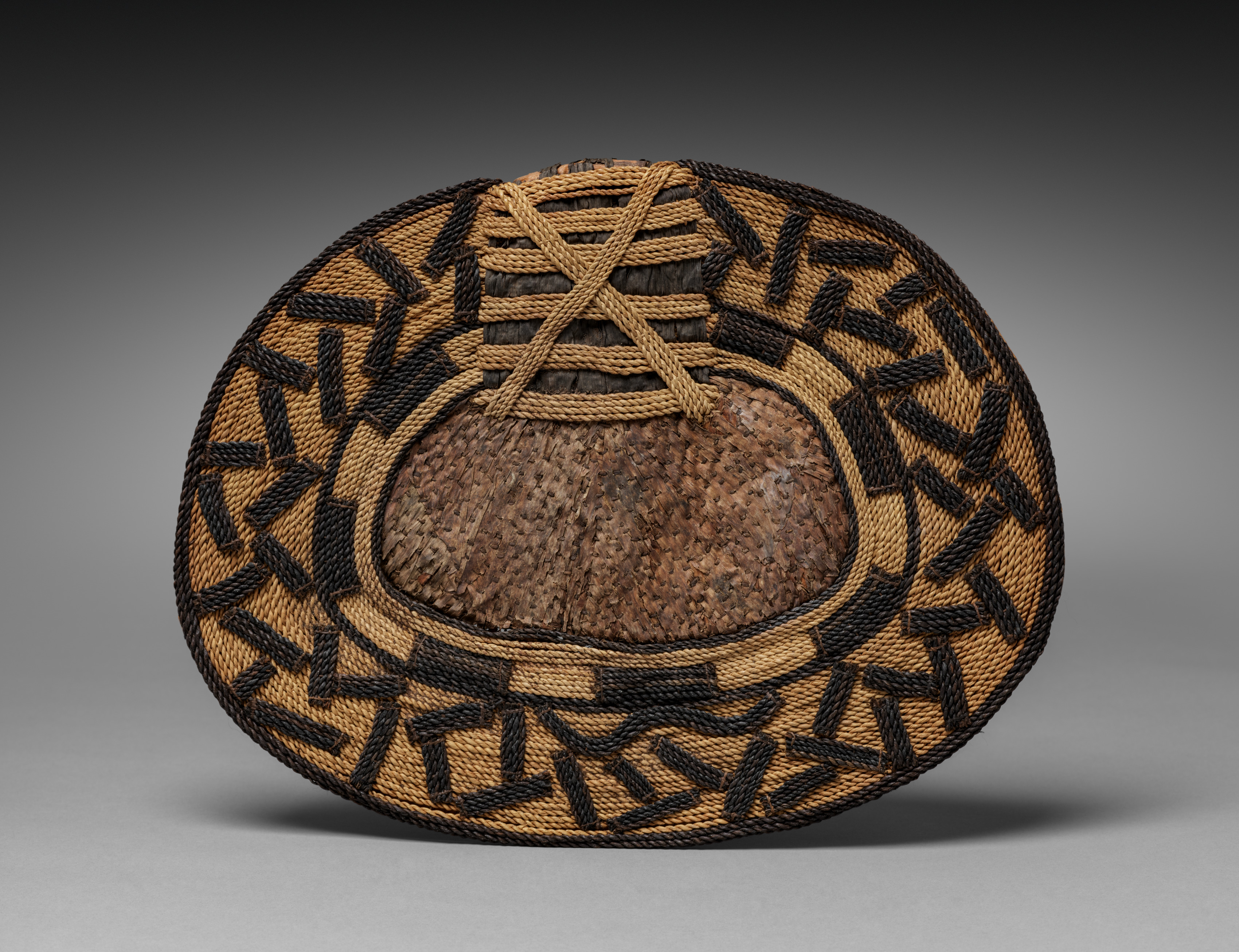 Round, flat object with a large oval-shaped opening in the center. The object is made of woven fibers, possibly straw or grass, in shades of brown and black. A pattern of black and tan woven lines covers the surface in a geometric design. A smaller oval shape is woven at the top of the object. The background is a gradient from dark gray at the top to light gray at the bottom. The object casts a shadow on the surface below. The object is titled "Back Skirt/Sitting Pad (negbe)" and is by an unknown artist.