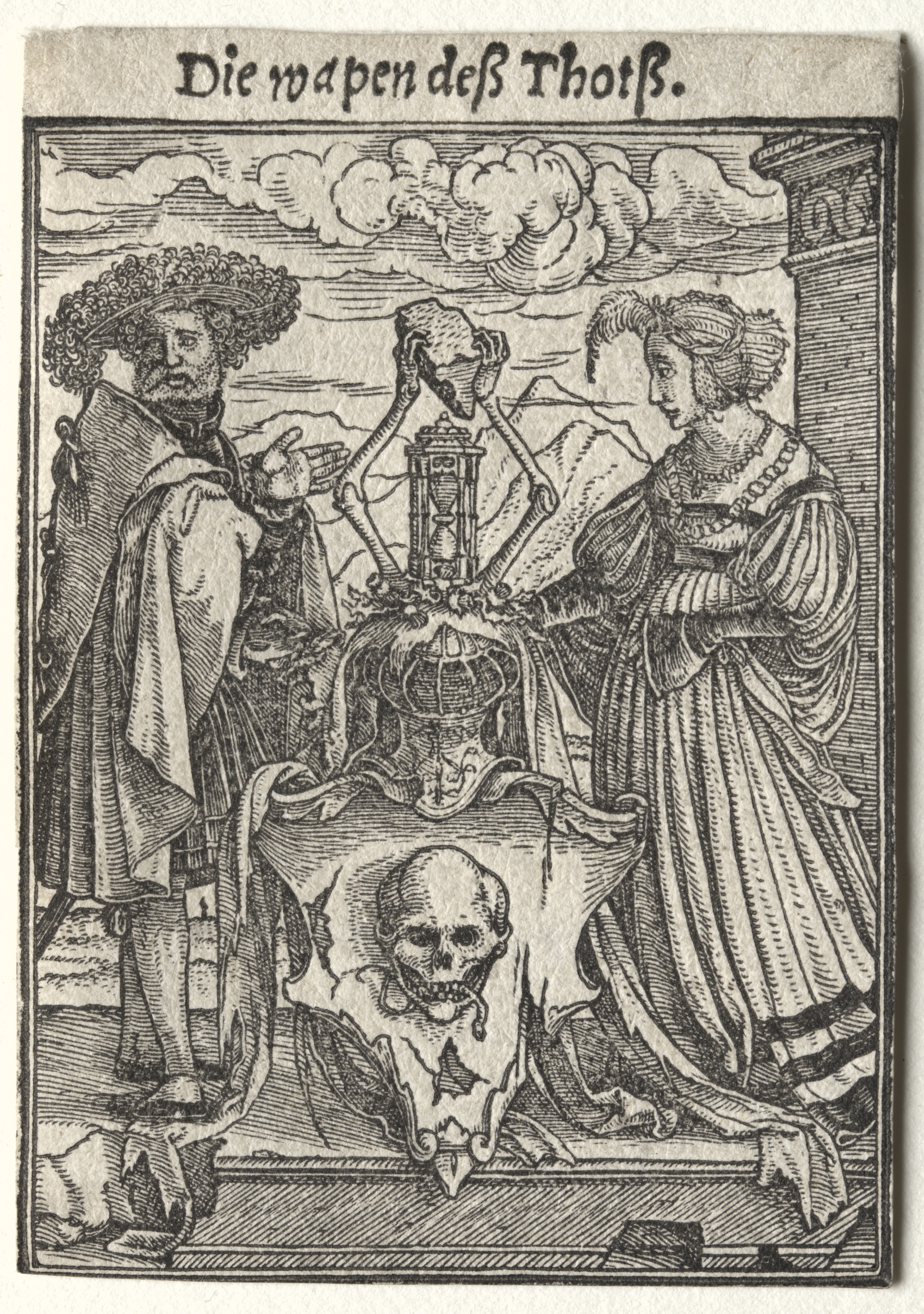 Black and white drawing of a man and woman on either side of a table with a skull on it. The man on the left wears a large hat and a cape. The woman on the right wears a long dress. A skull sits on the table in front of them. A candelabra sits on the table behind the skull. A curtain with a skull on it hangs behind the candelabra. There are clouds and a building in the background. Text is written at the top.
