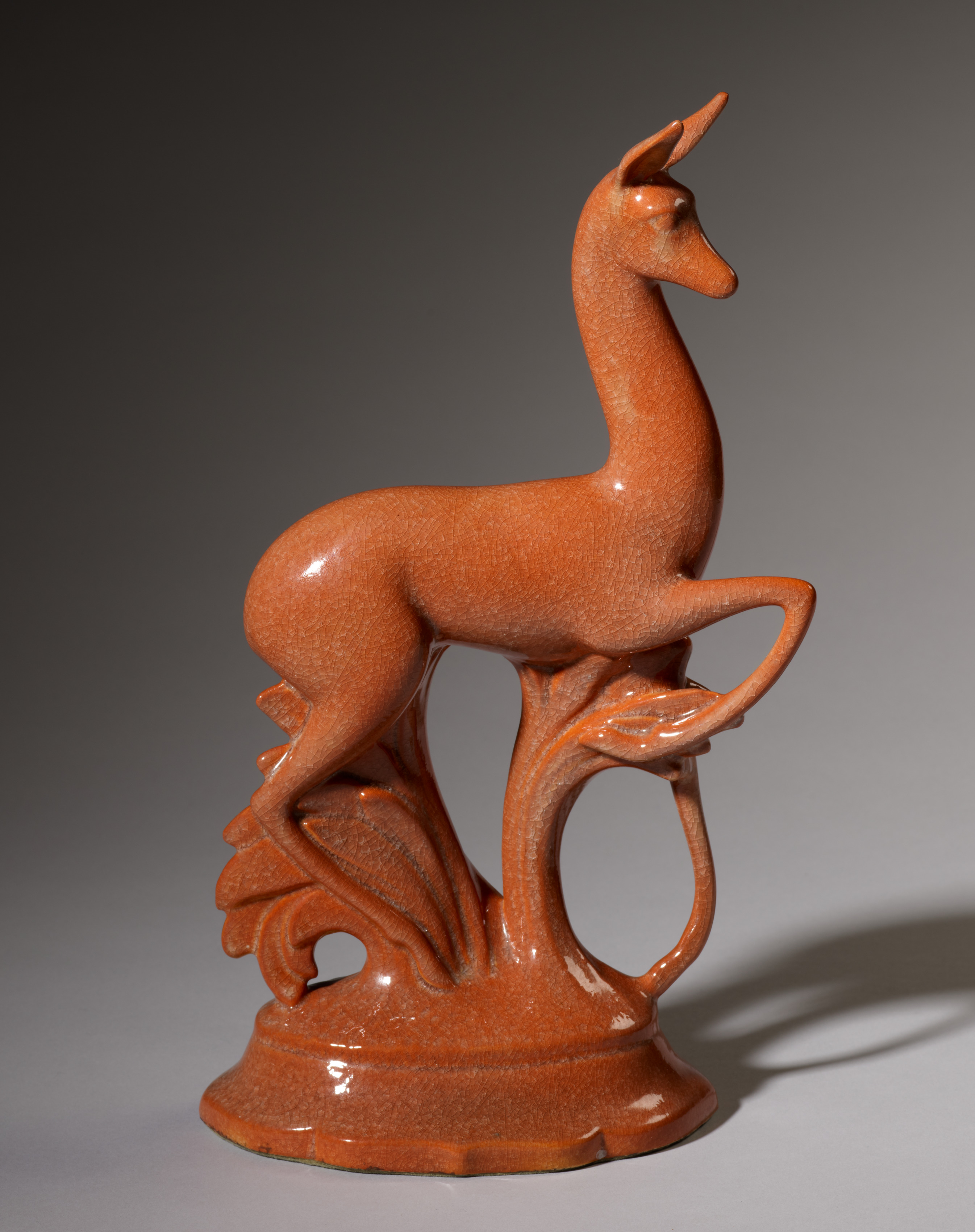 Orange ceramic sculpture of a fawn. The fawn has a long neck and stands on its hind legs on a leafy branch. The fawn's front right leg rests on a curved branch. The fawn's head is turned to the right. The fawn has two small ears. The sculpture sits on a flat base. The background is gray.
