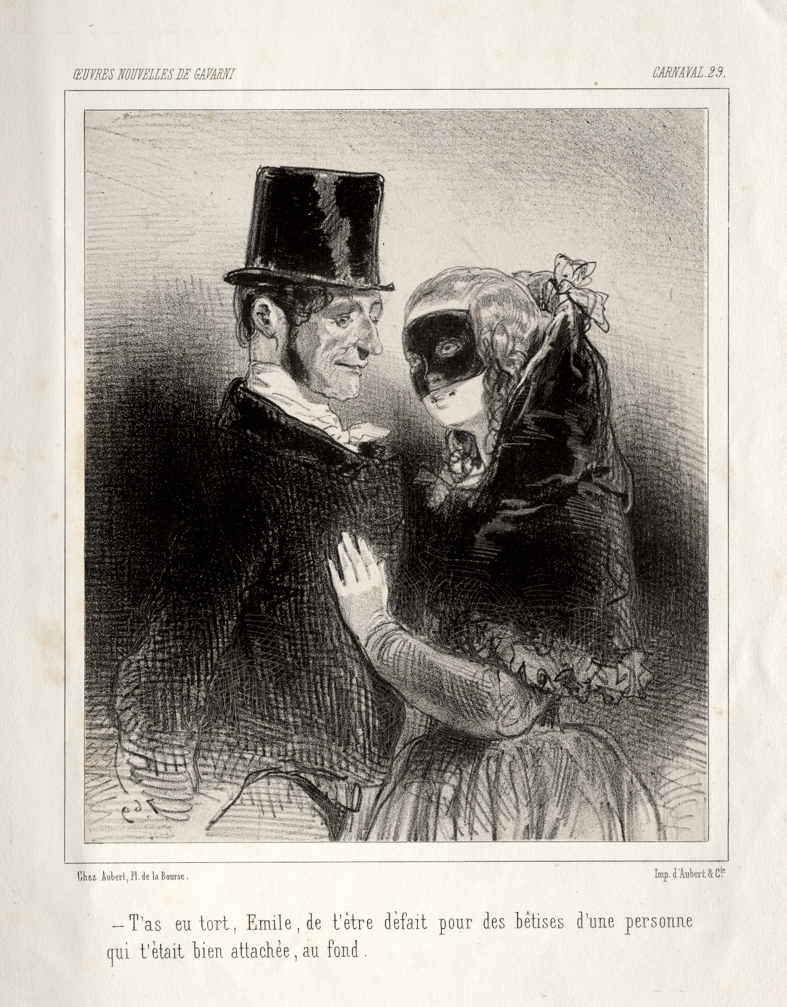Black and white drawing of a man and woman. The man on the left wears a top hat, dark coat and white shirt. The woman on the right wears a mask, a dark cloak over a dress. She places her right hand on the man's chest. The man looks toward the woman. Her head is turned toward him. Dark background. Text below image. Text in top left reads "oeuvres nouvelles de gavarni". Text in top right reads "carnaval 29".