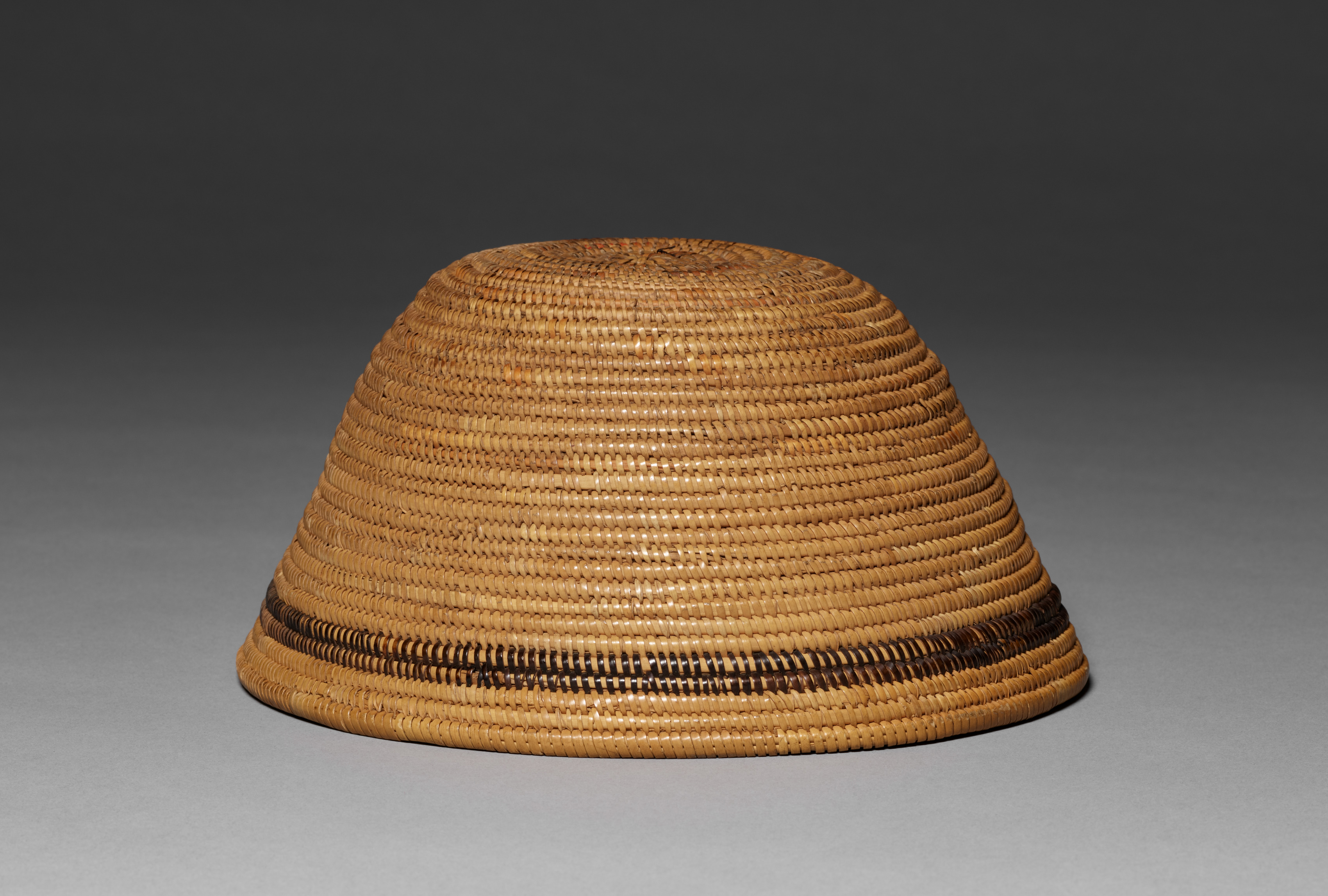 Light-brown woven hat with darker brown stripe around bottom, tapered sides, and rounded top; made of woven fibers; appears to be made by weaving or coiling technique; no visible brim; simple design. Title: Hat. Artist not specified.