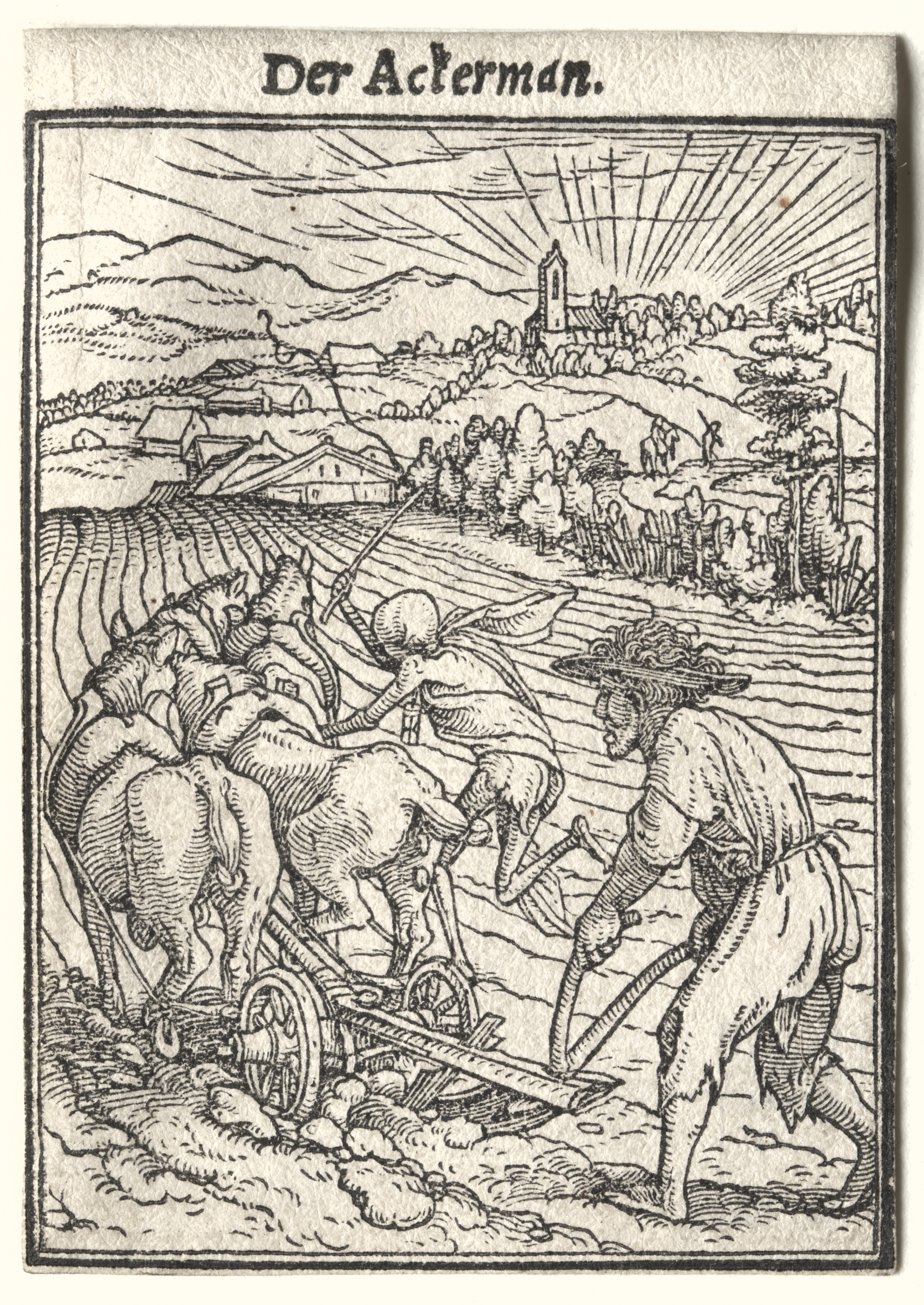 Black and white drawing of a man ploughing a field with two oxen. The man wears a wide-brimmed hat, a smock and breeches. He holds a plough and guides the oxen with a stick. The oxen have curved horns and harnesses. The field is ploughed and has ridges and furrows. In the background, there are trees, a church and buildings. The sun shines with rays extending from behind a church. The image is bordered with a thin black line and has text at the top. The text at the top reads "Der Ackerman". The image is set against a plain off-white background.