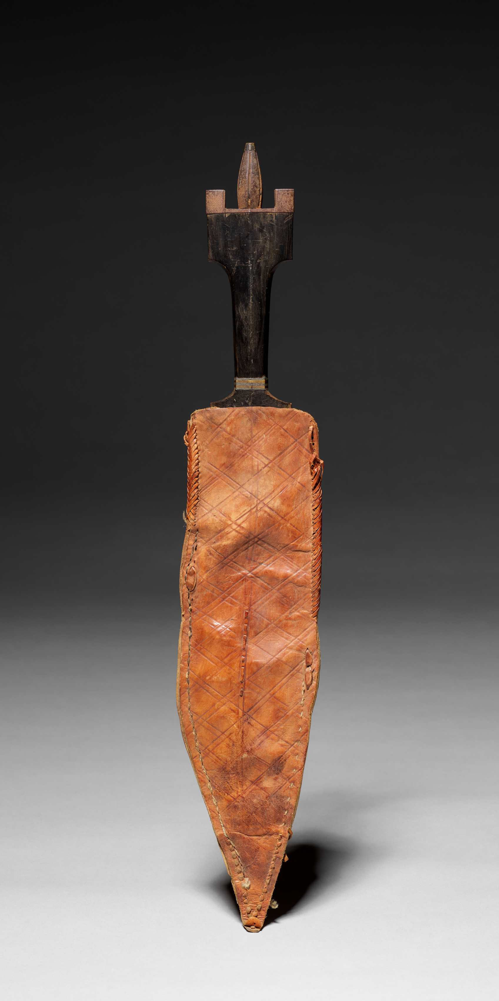 Knife by an unknown artist. A knife with a dark brown wooden handle and a brown leather sheath. The handle is visible above the sheath and has a distinctive shape, with a wide base that tapers to a narrower top. The sheath is made of brown leather and has a diamond-stitched pattern on it. The sheath is shaped like a dagger and has a pointed tip. The background of the image is a gradient of black to white.