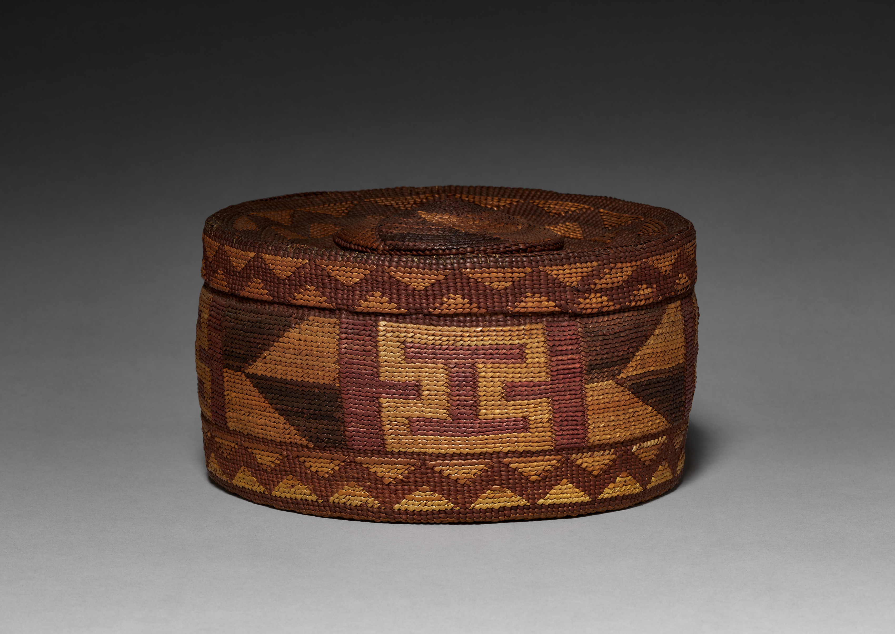 Brown and tan woven basket with geometric pattern, top and bottom have same pattern, geometric pattern on sides. The basket is titled "Basket with Rattle Top" by an unknown artist.