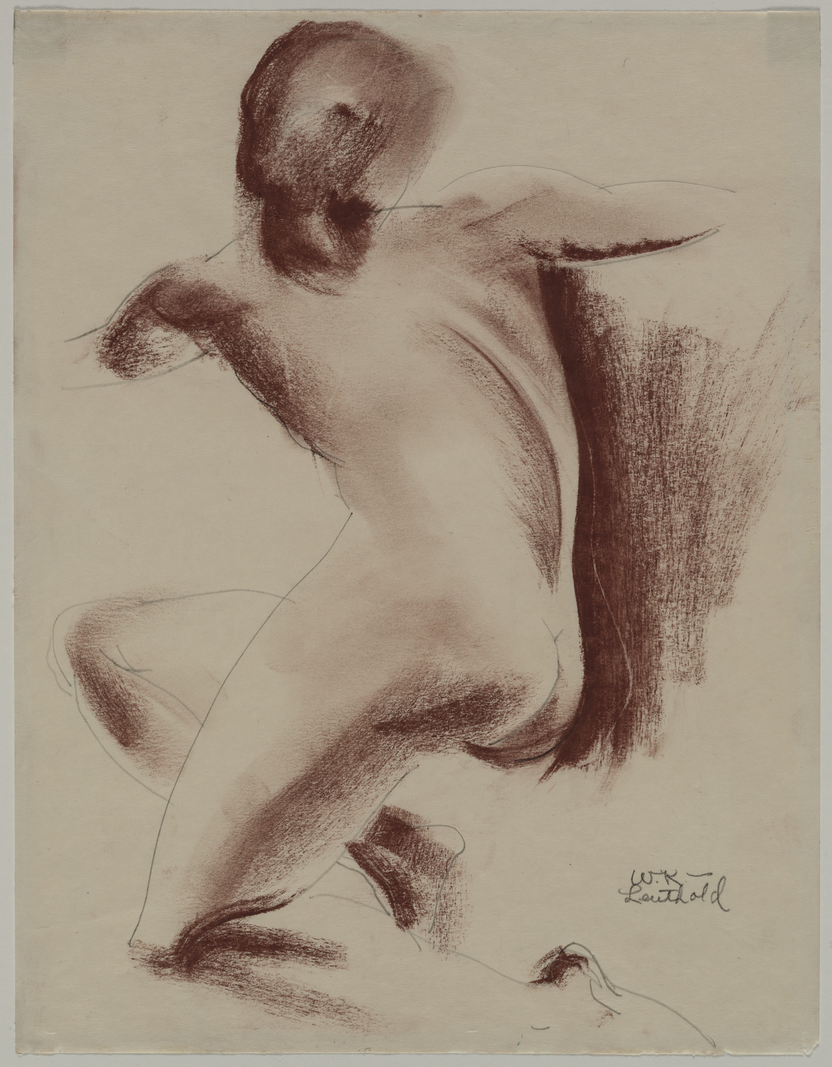 A nude figure drawing of a person posed on the ground on their hands and knees. The person's body faces to the right with their bent head obscured from view. Their left leg, on top, is bent at a 90-degree angle. Their left arm, on top, is extended behind. Their right leg is bent at the knee and extends to the bottom. Their right arm, on bottom, supports their body and is bent. The drawing is shaded with varying tones of brown on tan-colored paper. The drawing is signed in the bottom-right corner.