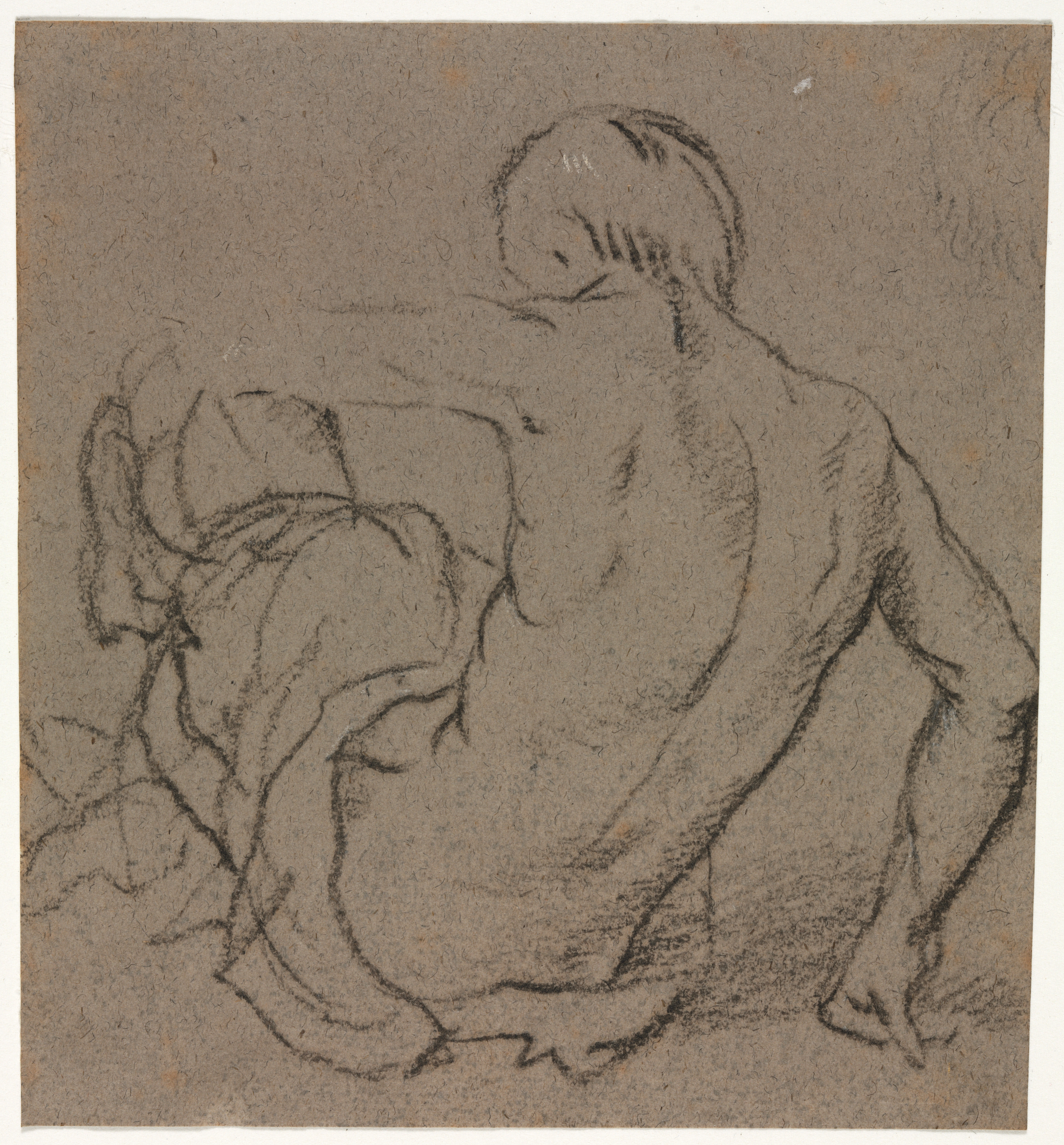 The image depicts a sketch of a man sitting on the ground, viewed from behind. The man is drawn in black pencil on a brown paper background. The man has short hair and appears to be nude. His left leg is bent, with his left foot positioned in front of his right leg. The man's right arm is bent at the elbow and rests on his right knee. A cloth or garment is draped over his left leg. The background of the image is a plain brown color, resembling paper with some darker texture and marks visible. The edges of the paper are rough and uneven.