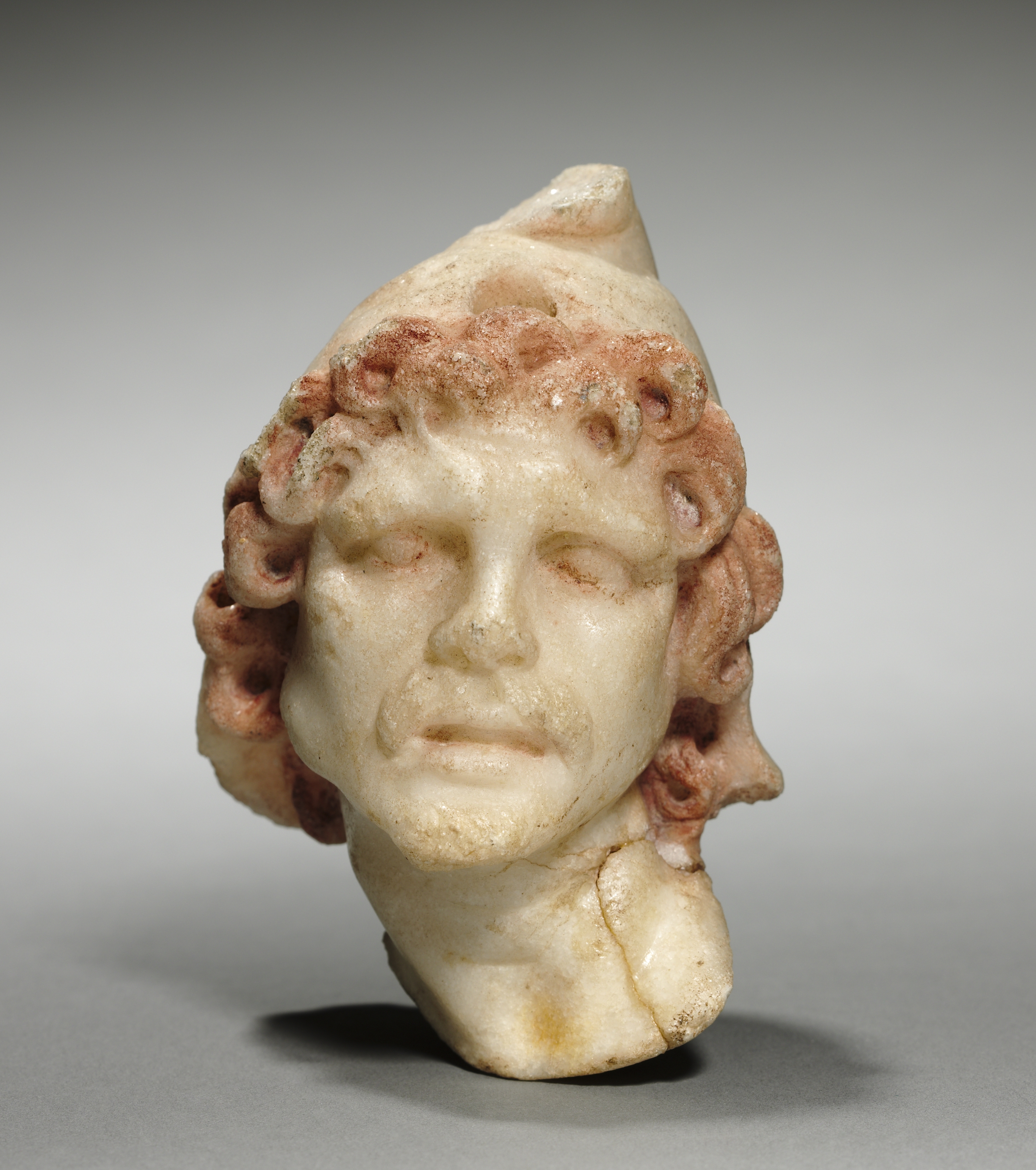 The sculpture depicts a male head with curly hair and a neutral expression, facing slightly to the right. The head is tilted slightly forward. The hair is curly and reddish-brown in color, while the rest of the face and head are off-white. A pointed object sits atop the head. The background is a gradient from dark gray at the top to light gray at the bottom. The sculpture appears to be made of stone or marble and has a few cracks and imperfections on its surface.