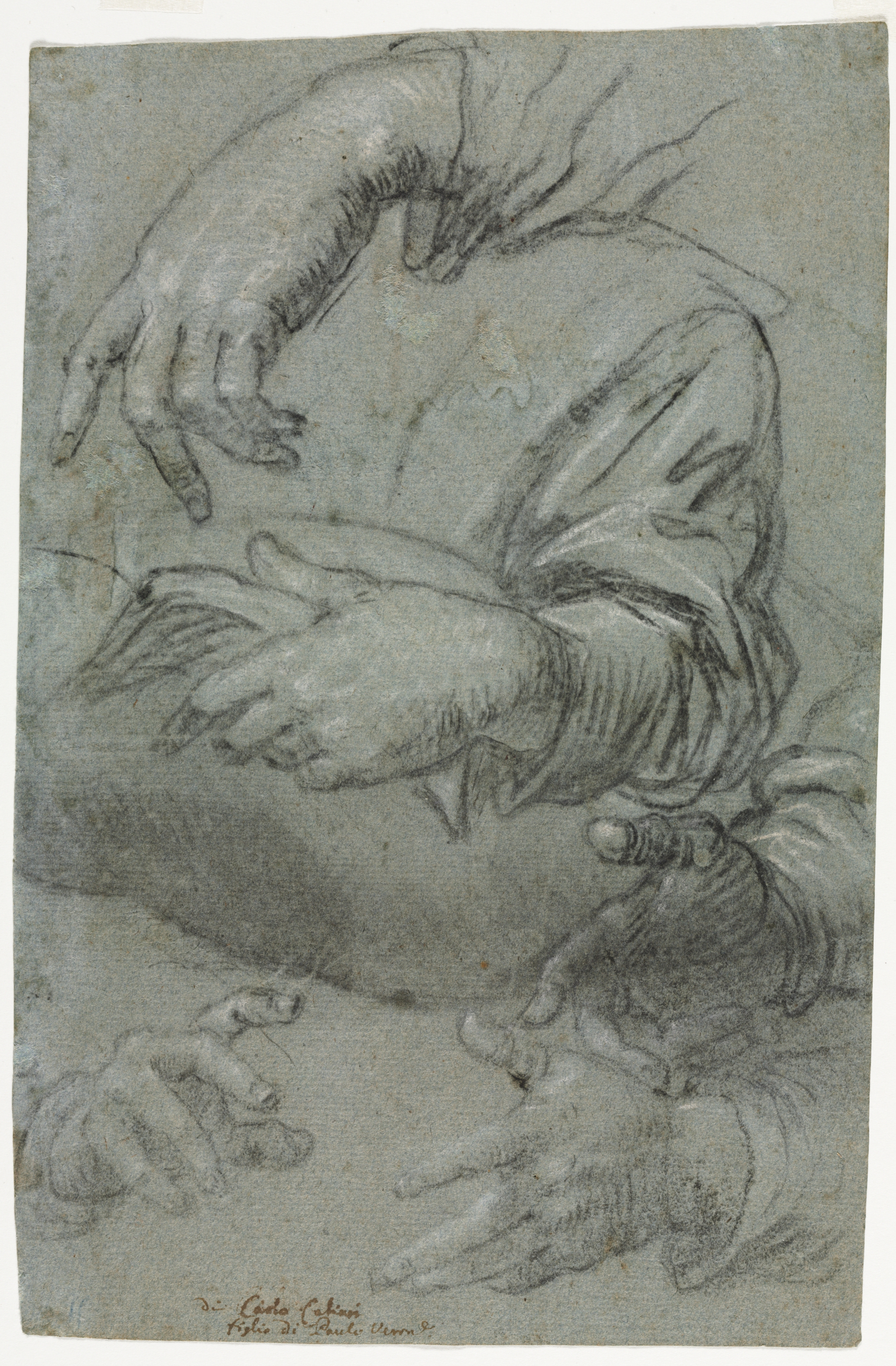 A sketch of multiple hands. The top hand extends from the left. The wrist is not shown. The forearm and elbow are visible. The elbow is bent. The second hand from the top is on the right. The wrist and part of the forearm are shown. The third hand from the top is on the left. The entire arm from the forearm to the tips of the fingers is shown. The fourth hand from the top is on the right. The wrist and part of the forearm are shown. The fifth hand from the top is on the left. The fingers are shown. A portion of the wrist is visible. All hands are drawn in black pencil on a gray background. The hands are drawn in various positions. Some fingers are extended, and some are curled. The sketch is signed in brown ink at the bottom. The text is difficult to read. The background of the image is white.
