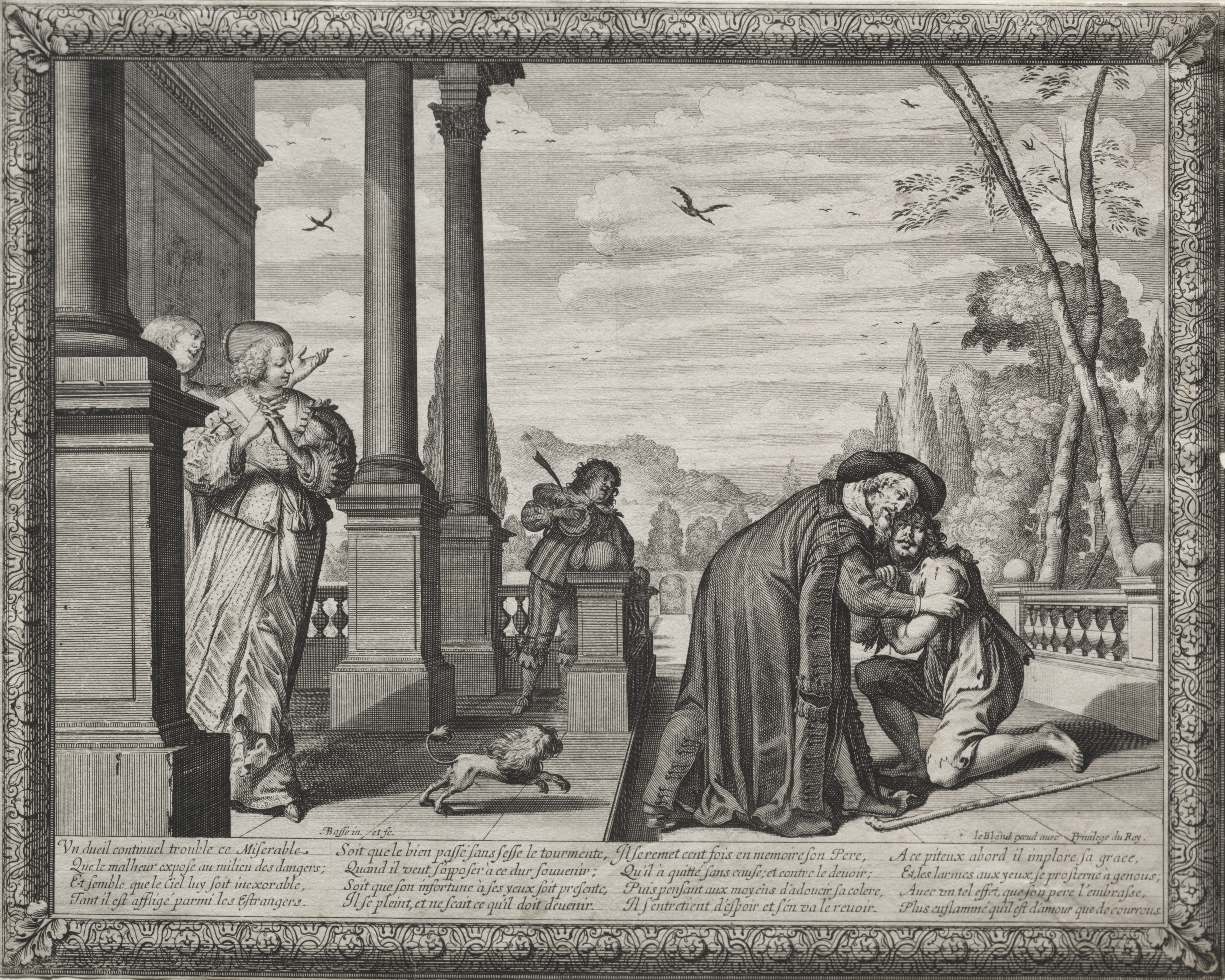 Black and white image of a man on one knee being hugged by an older man on a patio. A woman stands near a building to the left. A dog stands by her. Another man stands on a balcony behind them. There are columns on the patio. A decorative border surrounds the image. The background includes trees and a cloudy sky with birds flying.