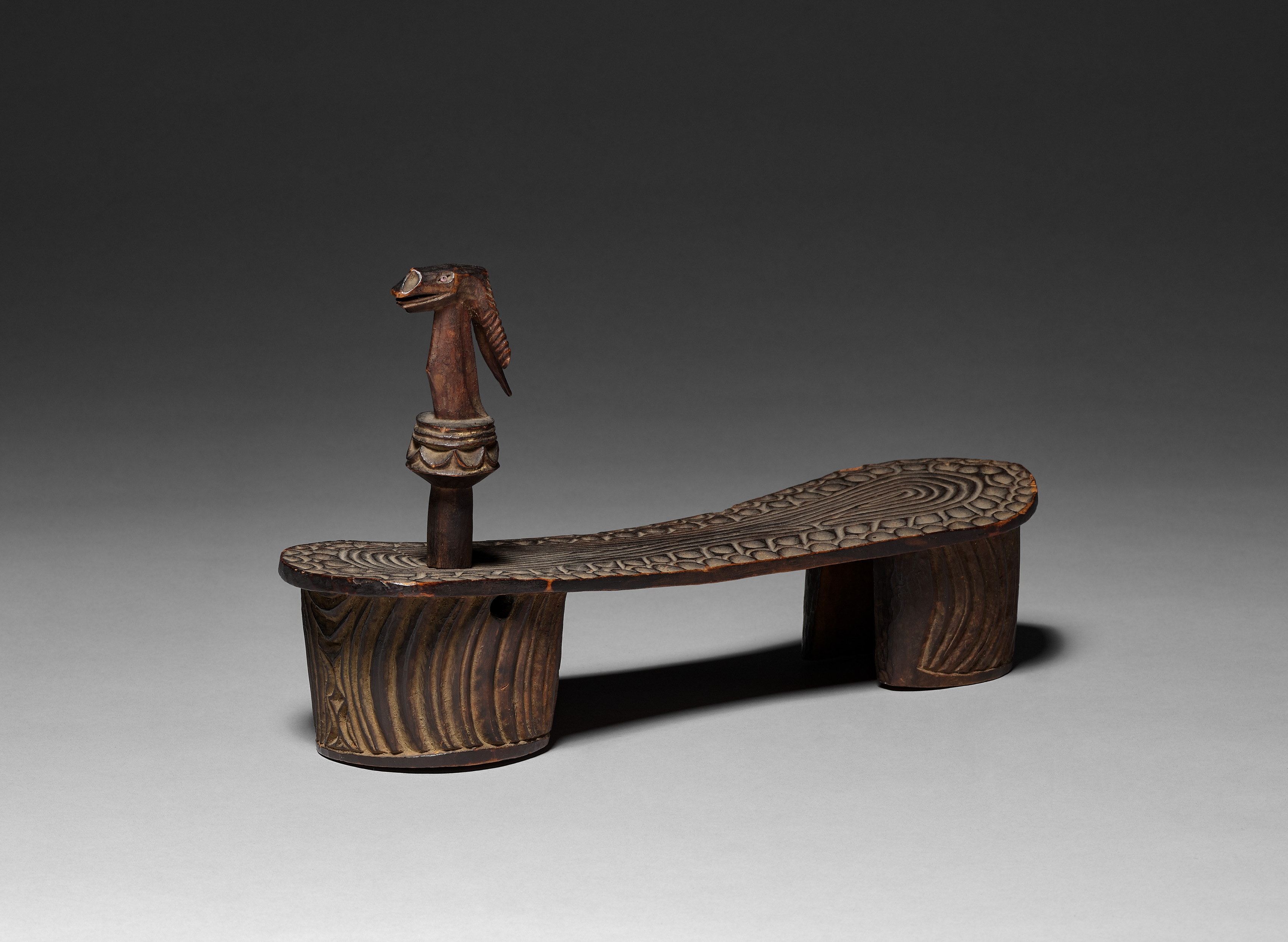 Wooden clog or sandal with carved decoration; made from dark brown wood; three cylindrical legs; seat is flat and patterned with carved curved lines; handle on left side is carved into animal head; animal head handle protrudes straight up then bends forward; background is gray to black gradient.