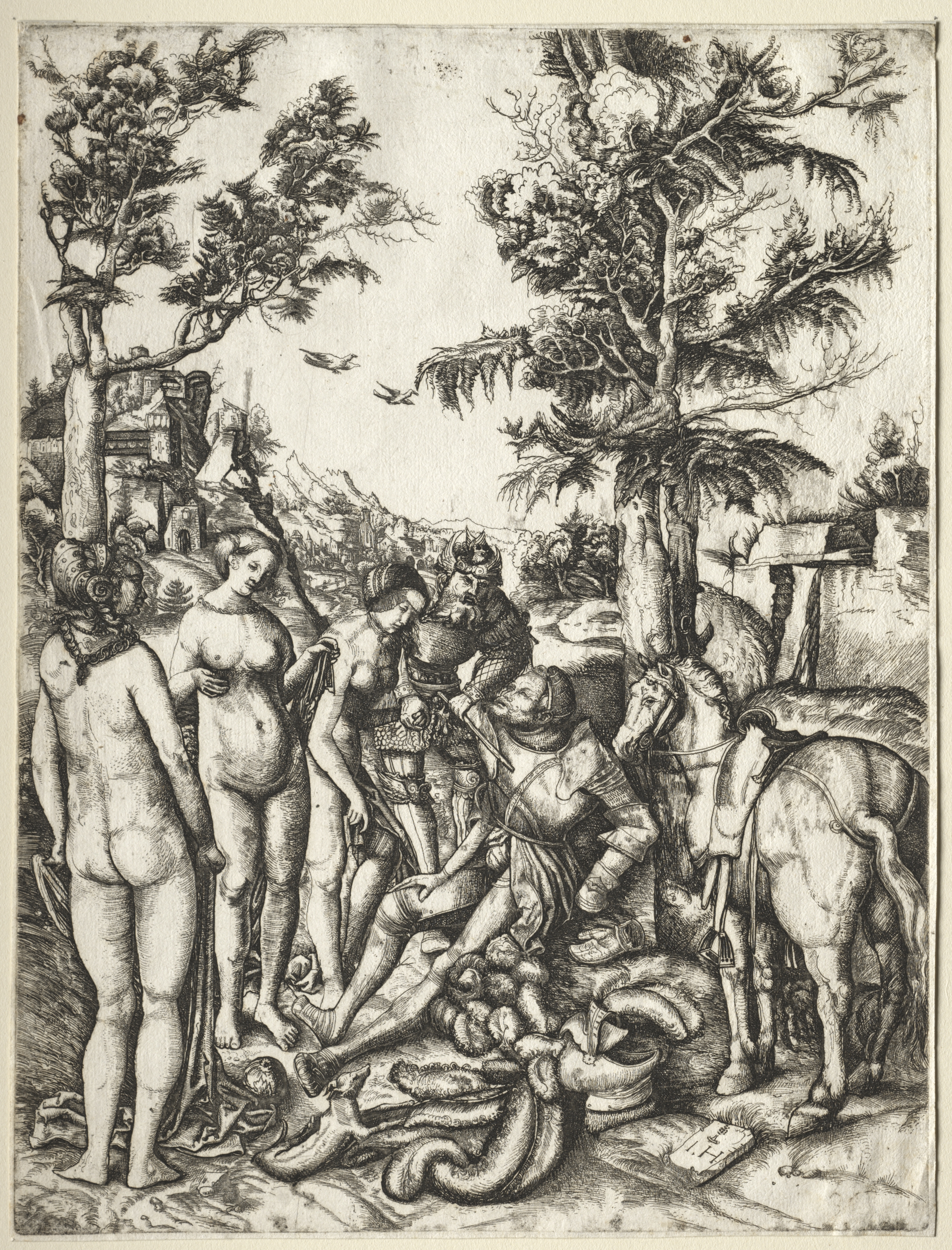 The image depicts a scene titled Judgment of Paris by Hieronymus Hopfer. The scene shows a kneeling man in armor on the right side looking at a nude woman on the ground. A horse stands beside the man. Three nude women stand on the left side. A tree with sparse leaves stands on the left and a tree with dense leaves on the right. A building with a pitched roof and chimney is on the left background. A mountain and a few trees are on the distant background. A landscape with a building is on the right background. Birds fly in the sky. The image is in black and white.