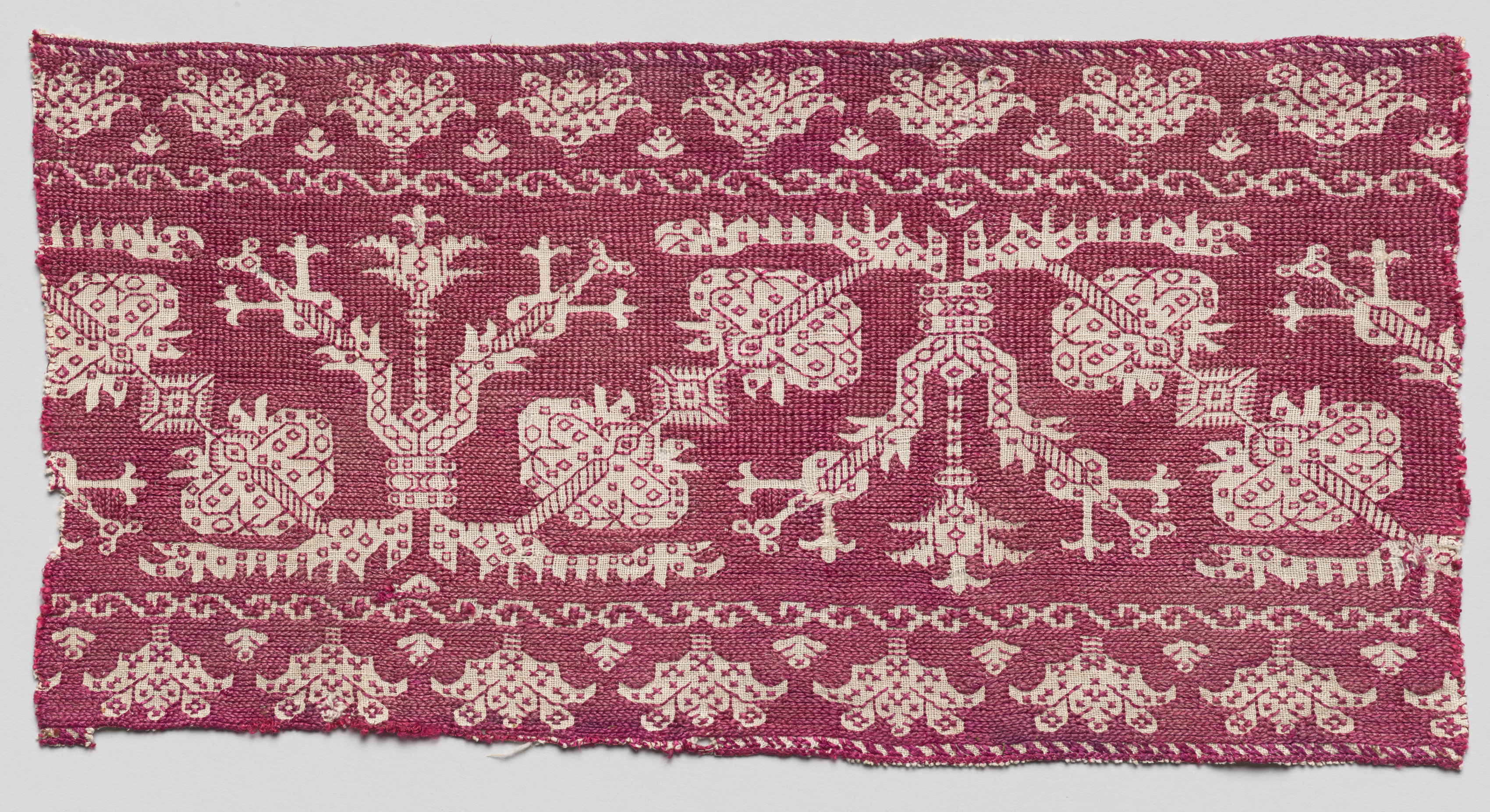 Red fabric with white designs. The fabric is rectangular and oriented horizontally. The fabric has a woven texture. The fabric has frayed edges on the left, right, and bottom. The top edge has short, straight stitches. The fabric is red with white designs. The white designs are floral and tree-like. The designs are symmetrical. There are two rows of designs on the fabric, one at the top and one at the bottom. The top and bottom rows of designs are similar, with a line of connected shapes in the middle. The main design on the fabric consists of four symmetrical, tree-like shapes. Each tree-like shape has a long, thin trunk and branches. The tree-like shapes have decorative details. The background of the image is light gray.