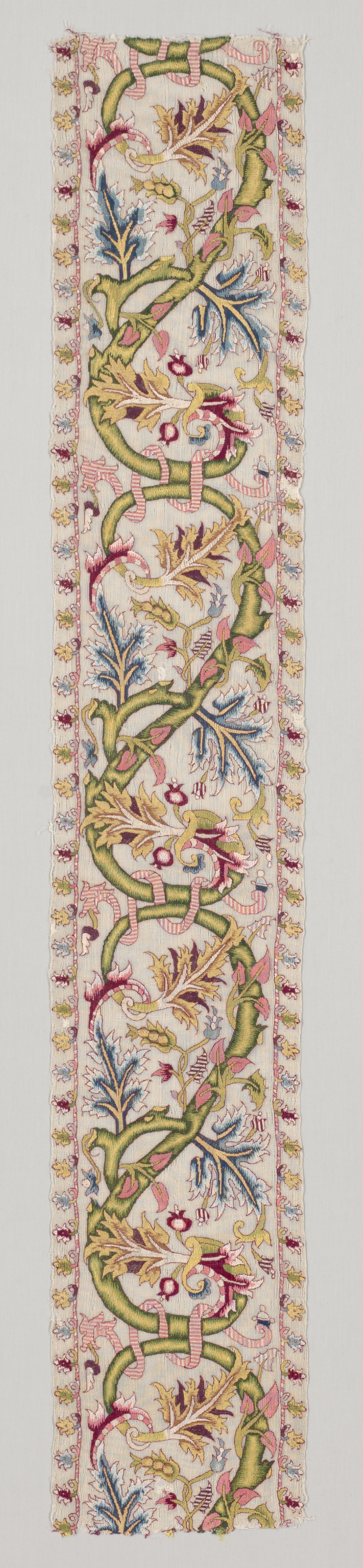 The Embroidered Strip by an unknown artist features a long, narrow, vertically oriented piece of fabric with a white background. The fabric has a repeating pattern of green curved lines that twist and turn, forming oval shapes. Inside and around these oval shapes are multicolored floral designs in shades of pink, blue, yellow, and red. A border on either side of the fabric features small, repeating designs in pink, yellow, blue, and green. The fabric appears to be hand-stitched with intricate embroidery. The background behind the fabric is light gray.