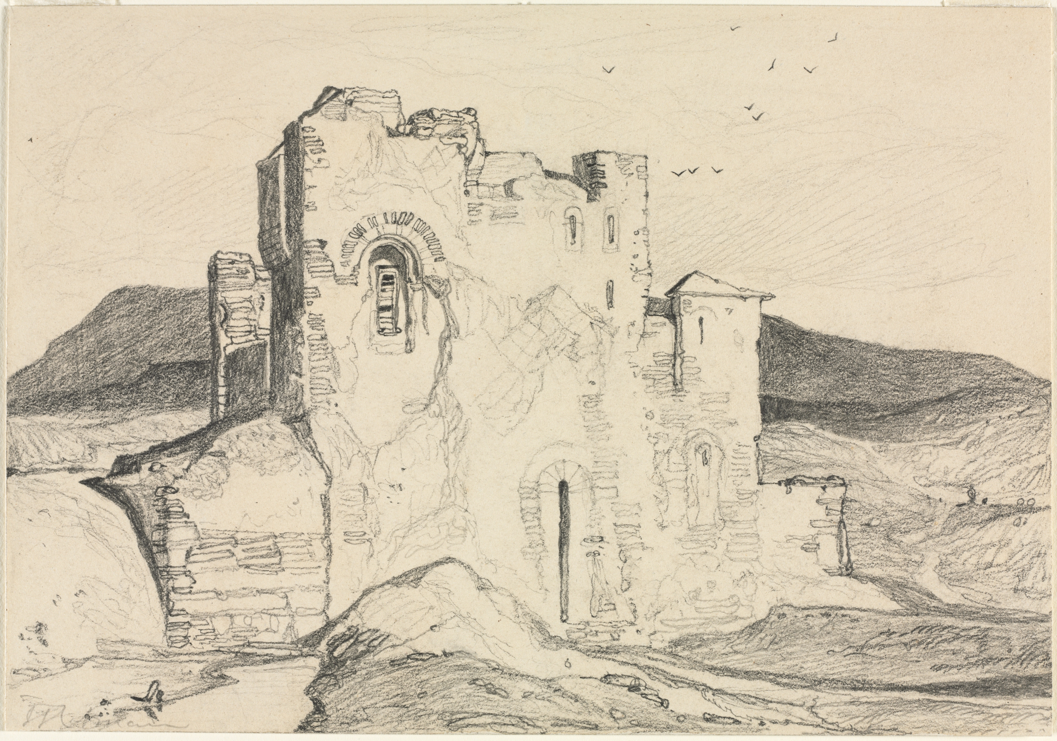 A castle in Normandy, a landscape drawing of a ruined castle. The castle is drawn in grayscale with a light-colored background. A tall wall with two towers on either side of a gate stands in the center. The left tower has an arched doorway, a small window above it, and a square window higher up. The right tower has one small window. The wall to the left of the towers is crumbling with a large gap. The background shows a hill behind the castle and birds flying in the sky. The artist is John Sell Cotman.