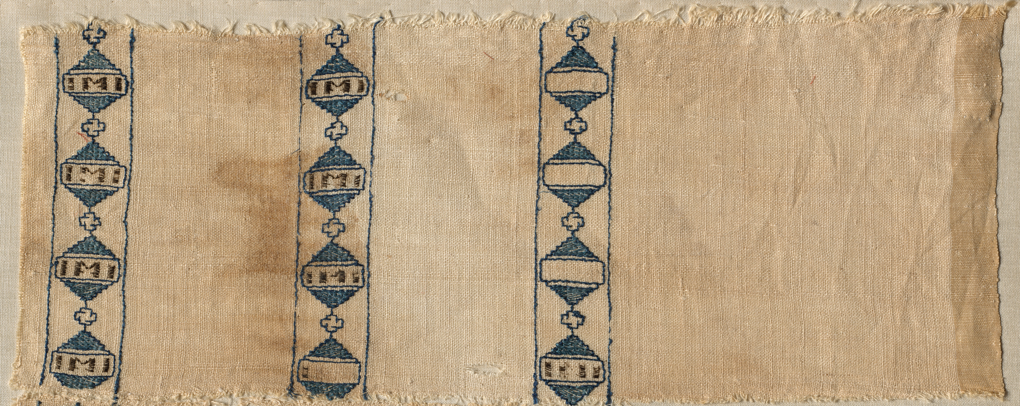 The image shows a rectangular piece of fabric with a tan background and blue embroidery. The fabric is tan, with a rough, frayed edge around all sides. There are three vertical lines of blue embroidery on the left side of the fabric. The embroidery on the two outer lines consists of repeating diamond shapes with a cross-like design inside, separated by small rectangular shapes with a design inside. The middle line of embroidery consists of a similar design but without the rectangular shapes. The rest of the fabric is empty, with some darker spots visible. The fabric appears to be a fragment of a scarf or headdress by an unknown artist, titled "Two Fragments of a Scarf or Headdress".