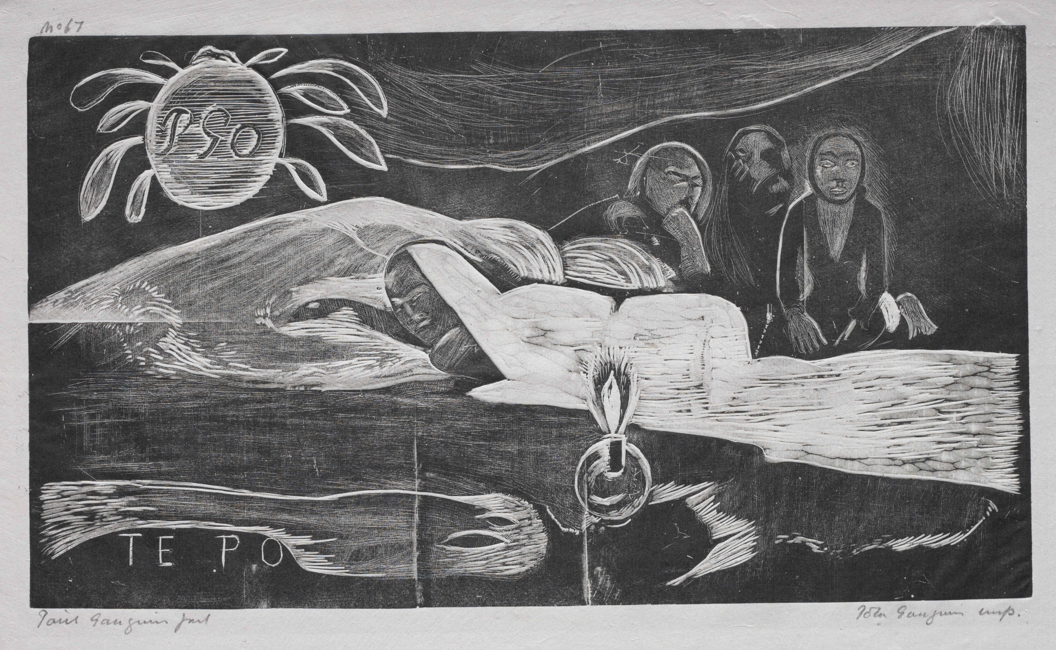 Black and white woodcut print. A reclining figure on a platform. Two behind on right. A sun with 'PO' in center top left. A flower above a ring on a stick bottom center. "TE PO" text bottom left. Dark background.