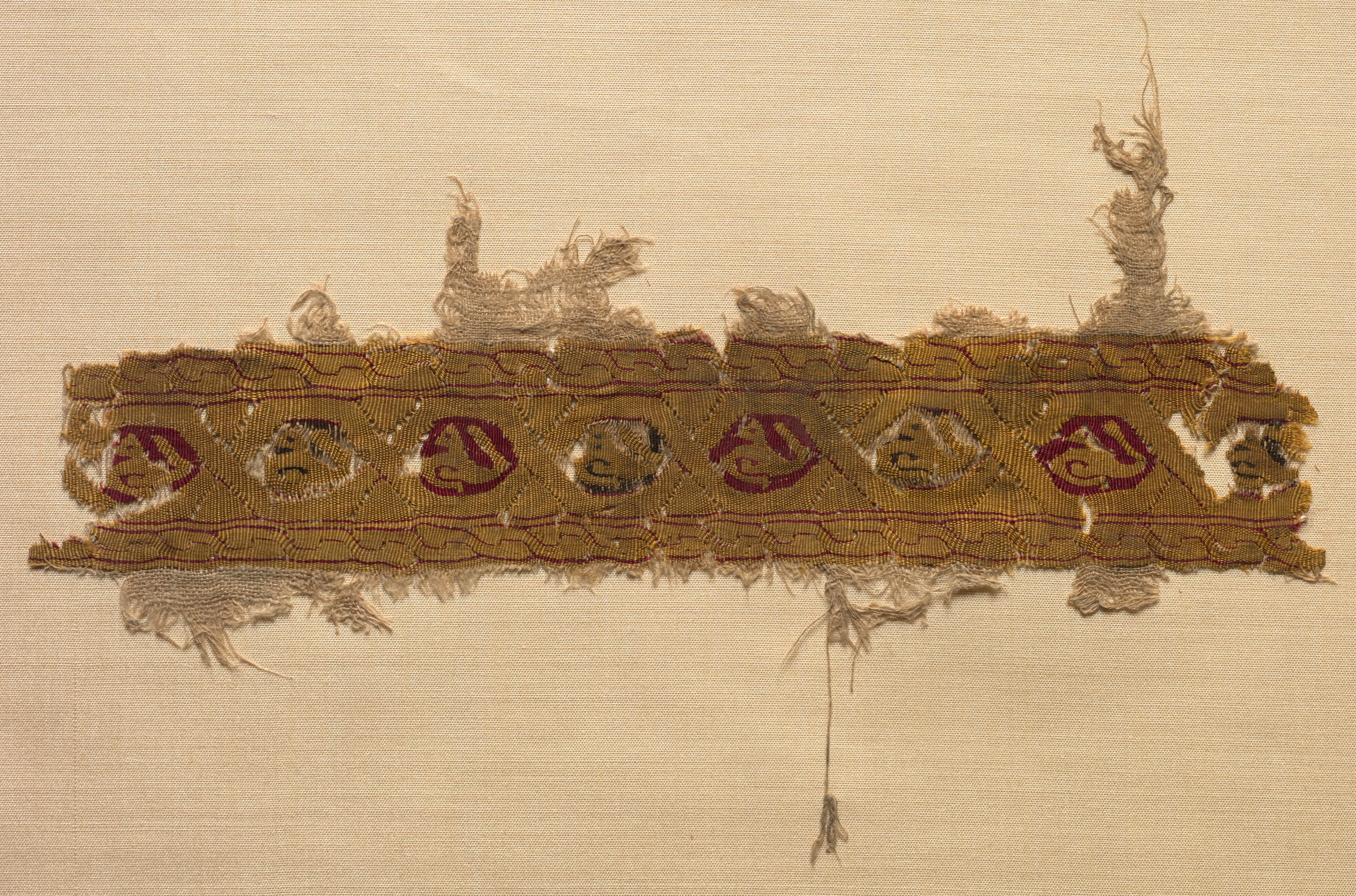 Fragment of a Tiraz-Style Textile by unknown artist. The image shows a horizontal strip of fabric with a repeating pattern. The strip is brown with a red and gold design. The design consists of circles with geometric shapes inside them. The shapes are outlined in red and have a gold interior. The circles are outlined in red and are spaced evenly apart. The fabric is frayed and torn in several places, with loose threads hanging down. The background of the image is a light beige color. The fabric appears to be old and worn, with visible signs of aging and deterioration. The image is a close-up shot, focusing on the details of the fabric.