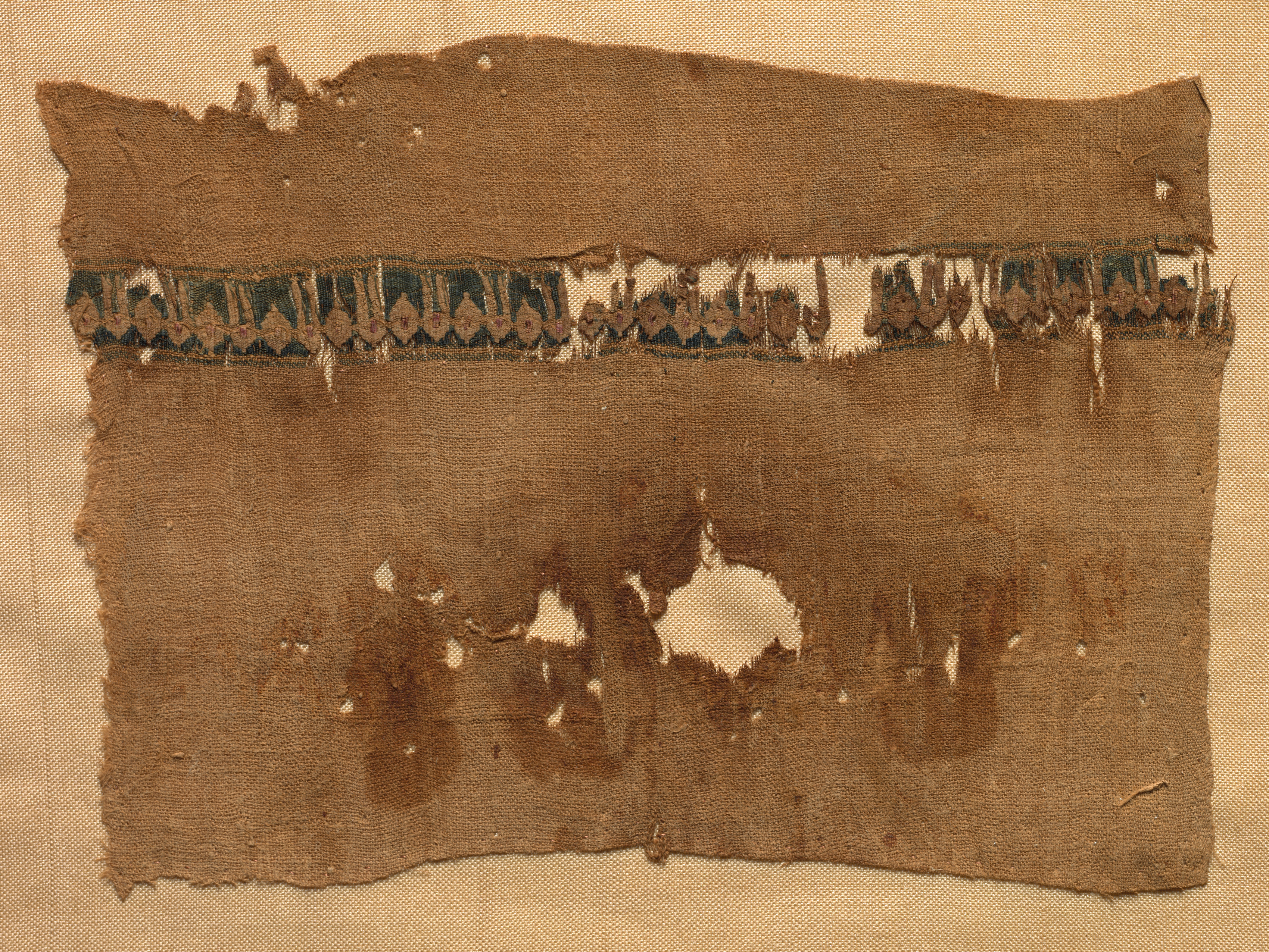 Brown textile fragment with frayed edges and holes. The top portion appears lighter brown than the rest. A horizontal band of dark green and light brown pattern runs across the middle. The background behind the textile is light brown. Fragment of a Tiraz-Style Textile.