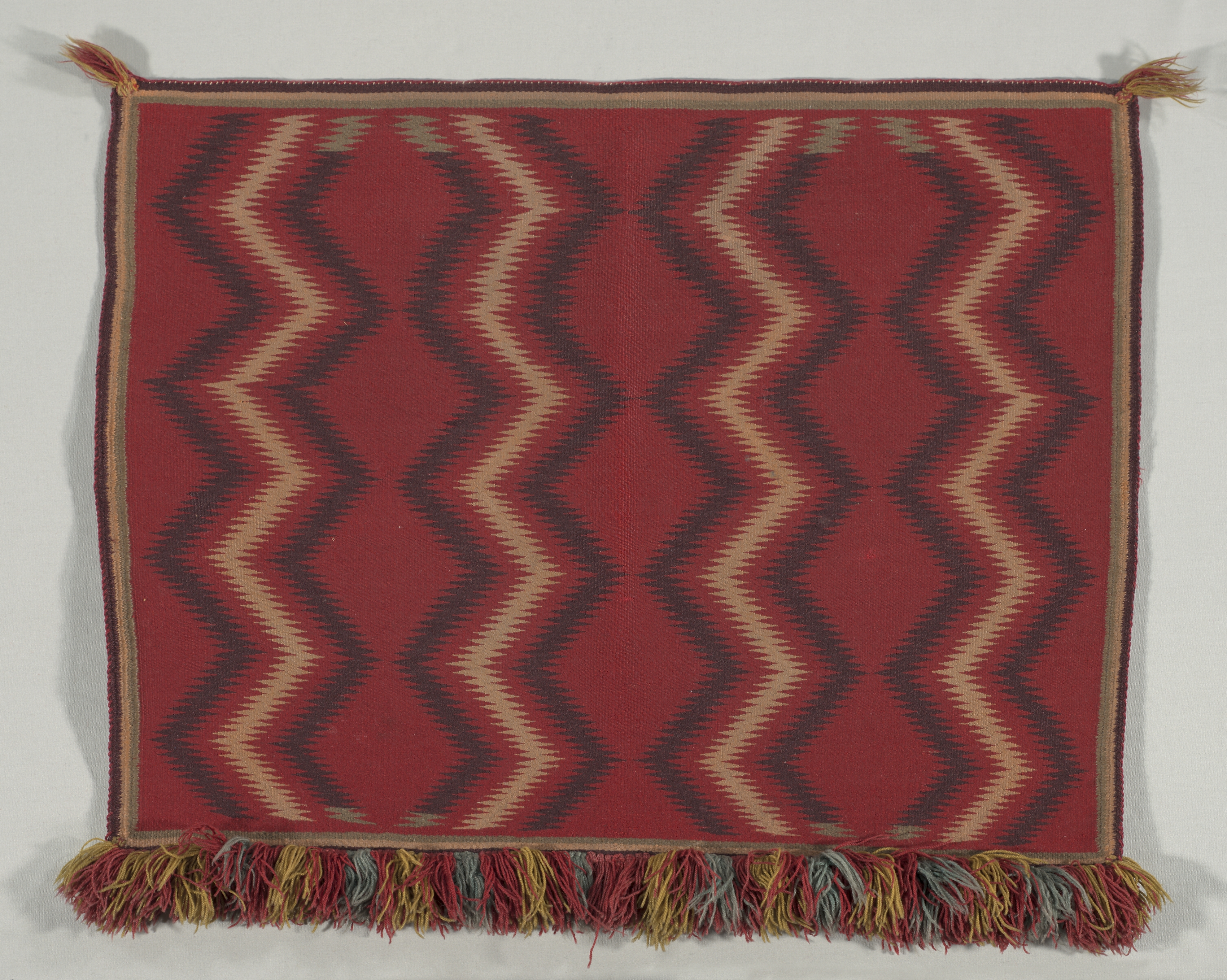 Red textile with zigzag pattern. Red zigzag patterned textile with dark brown and tan zigzag lines. The zigzags form diamond shapes. Tan and brown border. Multicolored fringe on bottom. Two short tassels on top. Square shaped.