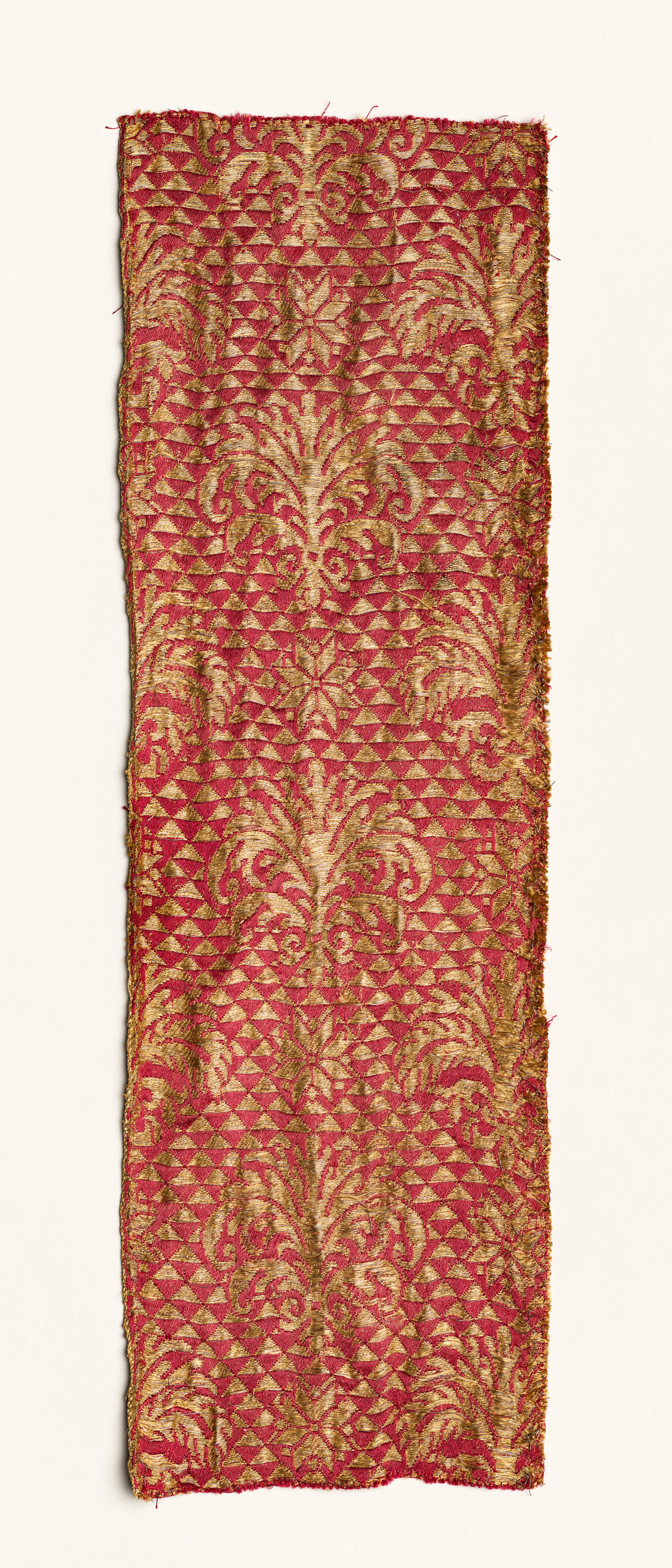 Red and gold rectangular fabric with frayed edges, featuring a repeating pattern of gold floral motifs on a red background. The fabric is oriented vertically, with a subtle sheen suggesting it may be made of silk or another luxurious material. The gold pattern includes curved lines and shapes resembling leaves or flowers. The fabric appears to be a fragment, as indicated by the title "Fragment".