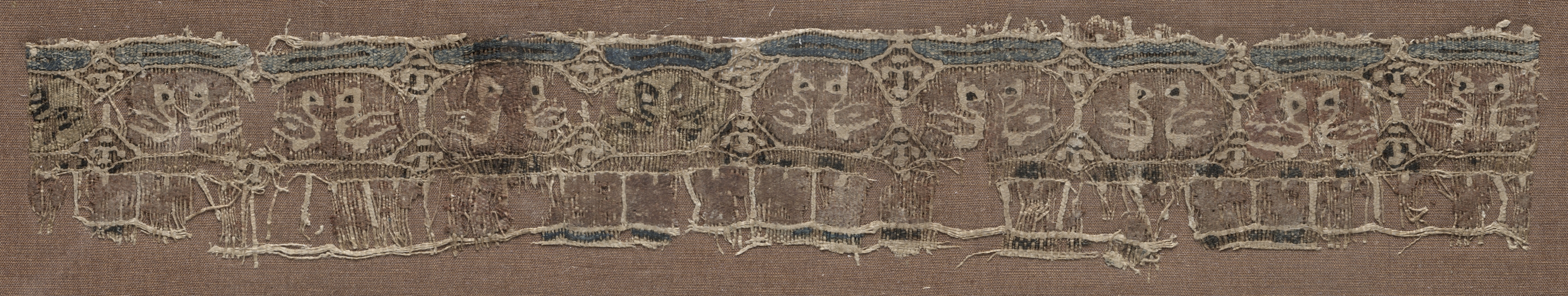 Fragment of a Tiraz-Style Textile by Unknown. The image shows a horizontal strip of fabric with a repeating pattern. The fabric is brown with a design woven into it. The design consists of two rows. The top row has a blue band at the top and bottom with beige designs in the middle. The beige designs are symmetrical and appear to have a floral motif. The bottom row is primarily beige with a band of blue at the top and bottom. The blue bands are narrow. The beige areas of the bottom row are deteriorated and frayed, resembling fringe. The entire piece appears to be frayed and deteriorated. The background behind the fabric strip is solid brown.