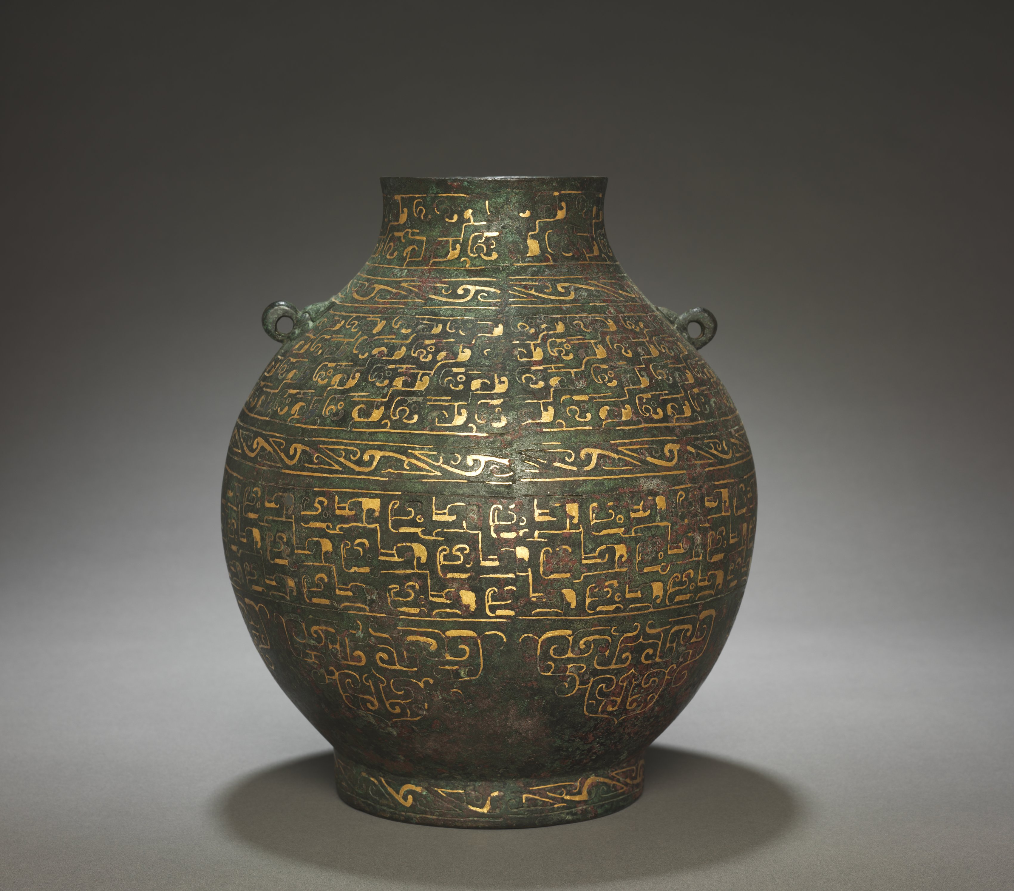 The Wine Vessel (Hu) by Unknown Artist is a bronze artifact with a dark green patina and gold inlays. The vessel has a rounded body with a narrow neck and a wide mouth. Two small handles are positioned on either side of the neck. The body of the vessel is decorated with intricate gold inlays that form various patterns and symbols. The patterns include curved lines, geometric shapes, and inscriptions. The background of the image is a gradient of dark gray to light gray, with the vessel casting a shadow on the surface below it.