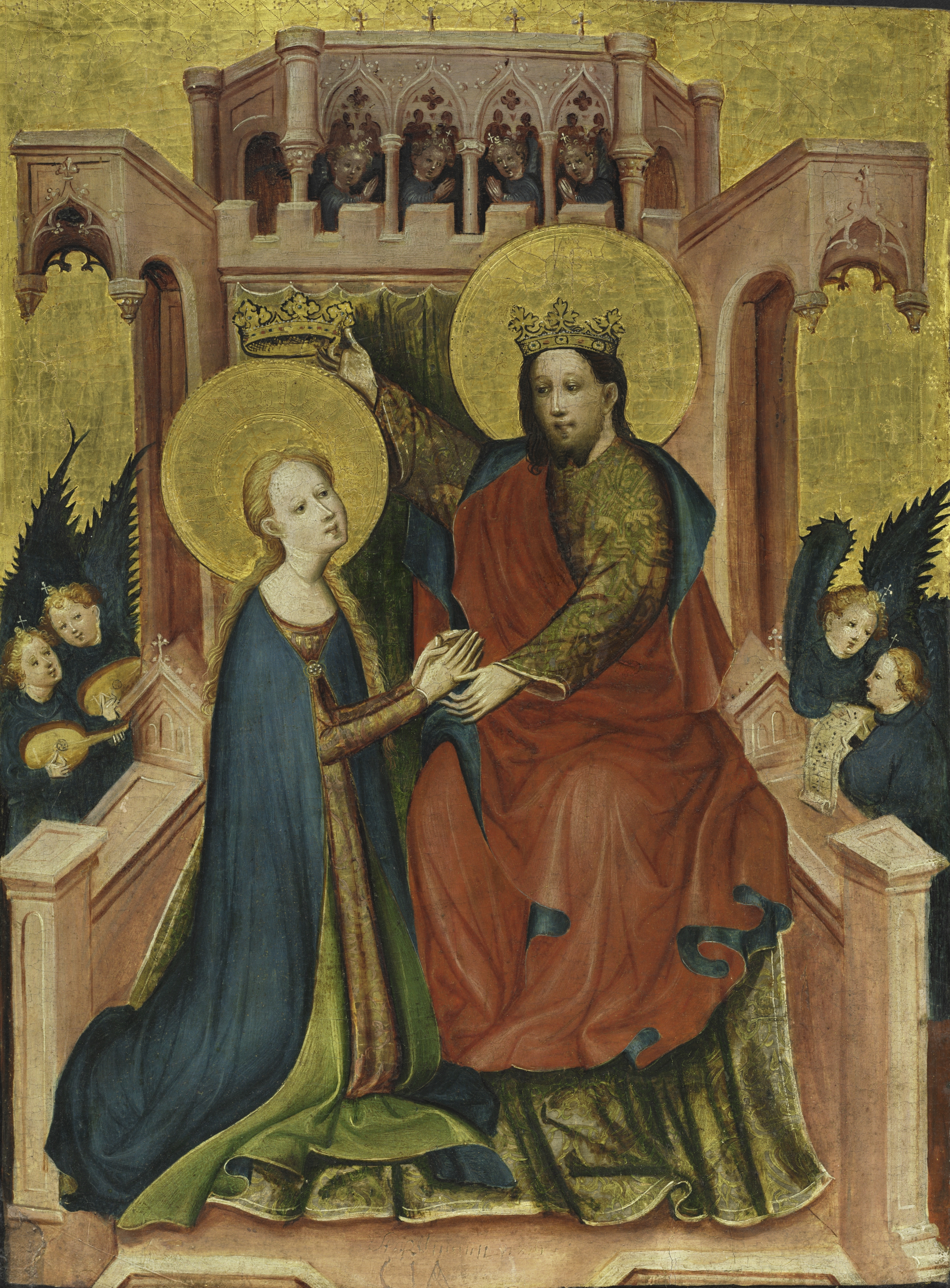 The painting depicts a scene with two central figures. The figure on the left is a woman with a halo, wearing a blue cloak over a green dress. She has her hands clasped together in front of her, being touched by the hand of the figure on the right. The figure on the right is a man with a halo and a crown, wearing a red robe over a green shirt. He sits on a throne-like chair. Behind the figures are several smaller angelic figures, some with wings. The background features a gold-colored wall with architectural elements, including arches and a balcony with four figures. A church building is visible behind the angels on either side. The woman's halo and the man's halo are both gold-colored and circular. The man's crown is also gold-colored. The scene appears to be set indoors, with a formal or ceremonial atmosphere.