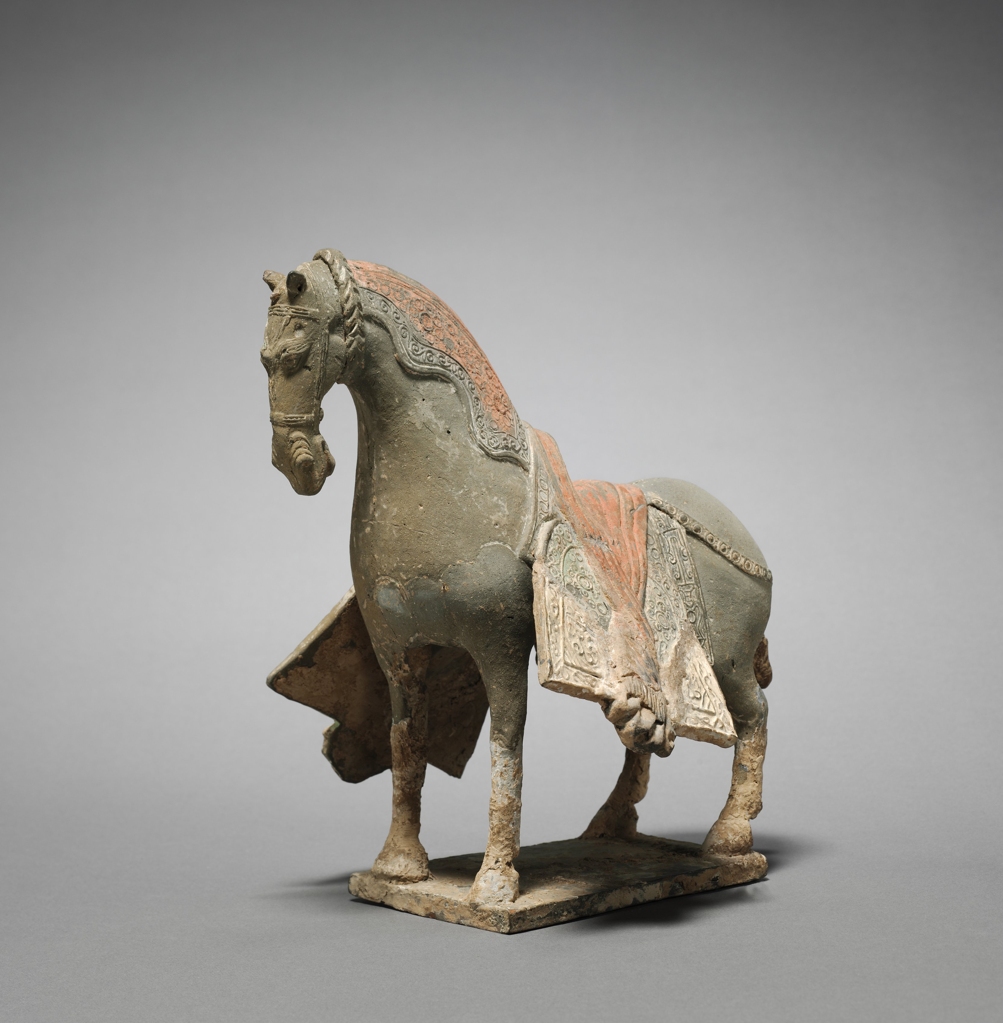 The sculpture titled "Mortuary Horse" by an unknown artist depicts a gray horse positioned on a flat rectangular base. The horse features a braided mane and a saddle-like covering on its back with a predominantly orange and gray color scheme. A decorative piece of fabric or cloth hangs down from the horse's left side. The horse's head is turned to the left, showcasing a detailed design on its face and neck. The overall appearance suggests an ancient or historical piece.
